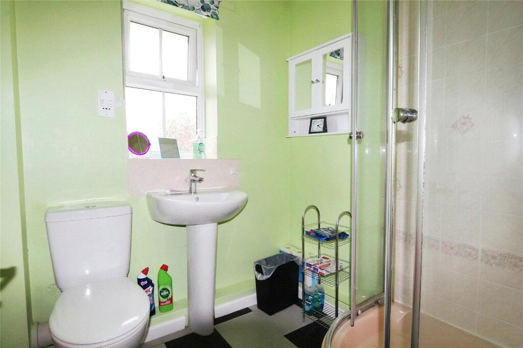UPVC obscure double glazed window. Close couple WC, pedestal wash hand basin and large fully tiled corner shower cubicle. Extractor fan, wood laminate flooring, electric shaver point, radiator. - Outside - Rear