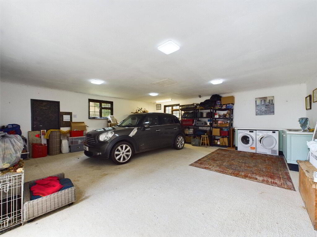 With twin electric roller doors. Power and Light connected. Pedestrian door to side. Utility area with base mounted units with a stainless steel sink unit and plumbing and recess for washing machine and tumble dryer.