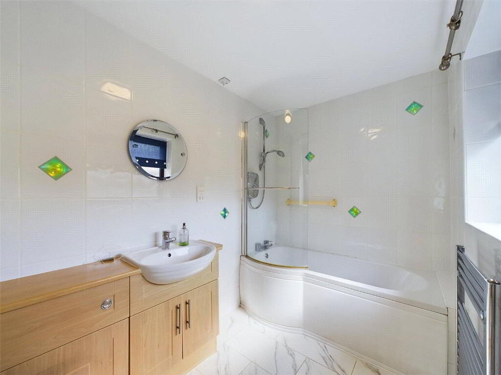 Enclosed P shaped bath with mixer taps and electric Triton shower over, vanity unit with inset wash hand basin, concealed cistern WC, heated towel rail, opaque glazed window to front elevation.