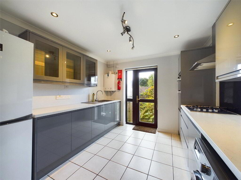 A fitted range of base and wall mounted units with work surfaces over incorporating composite 1 1/2 sink drainer unit with mixer tap, 4 ring gas hob with extractor hood over, built in double oven/grill, space and plumbing for washing machine, recess for tall fridge freezer. Door to side elevation.