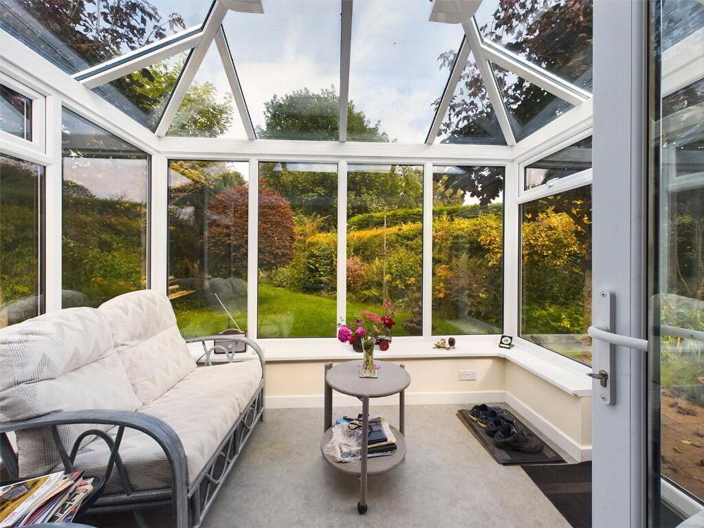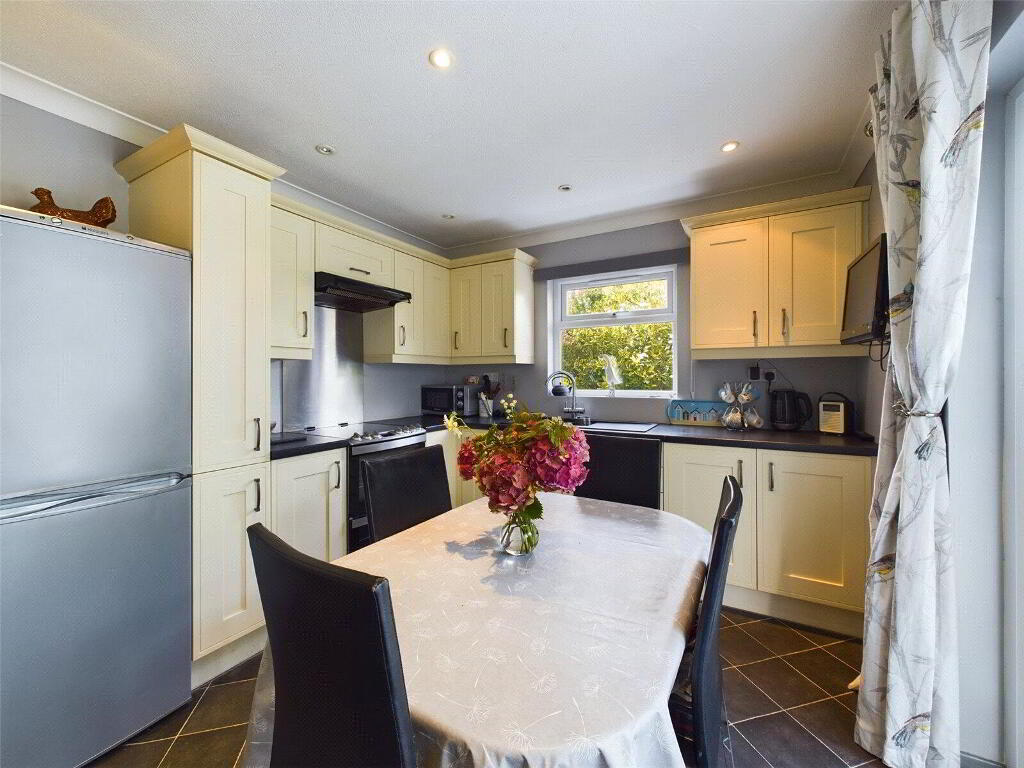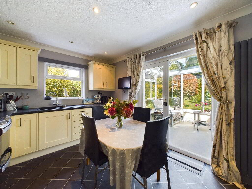 A fitted kitchen comprising a range of matching wall and base mounted unit with work surfaces over incorporating a composite 1 1/2 sink drainer unit with mixer taps. Space for cooker with extractor over. Space for free standing fridge/freezer. Access to laundry and airing cupboard. Ample room for dining table and chairs. Window to side elevation, French patio doors to conservatory.