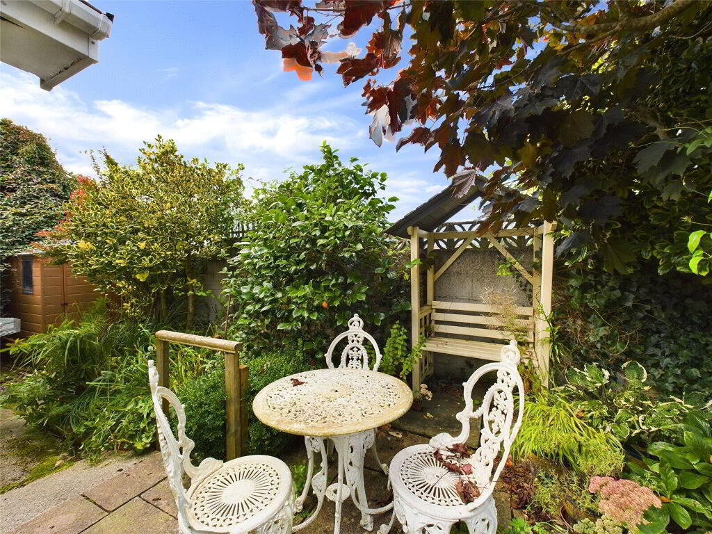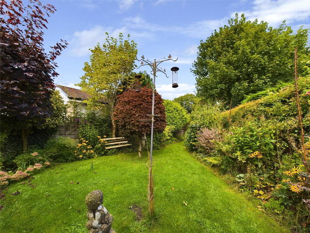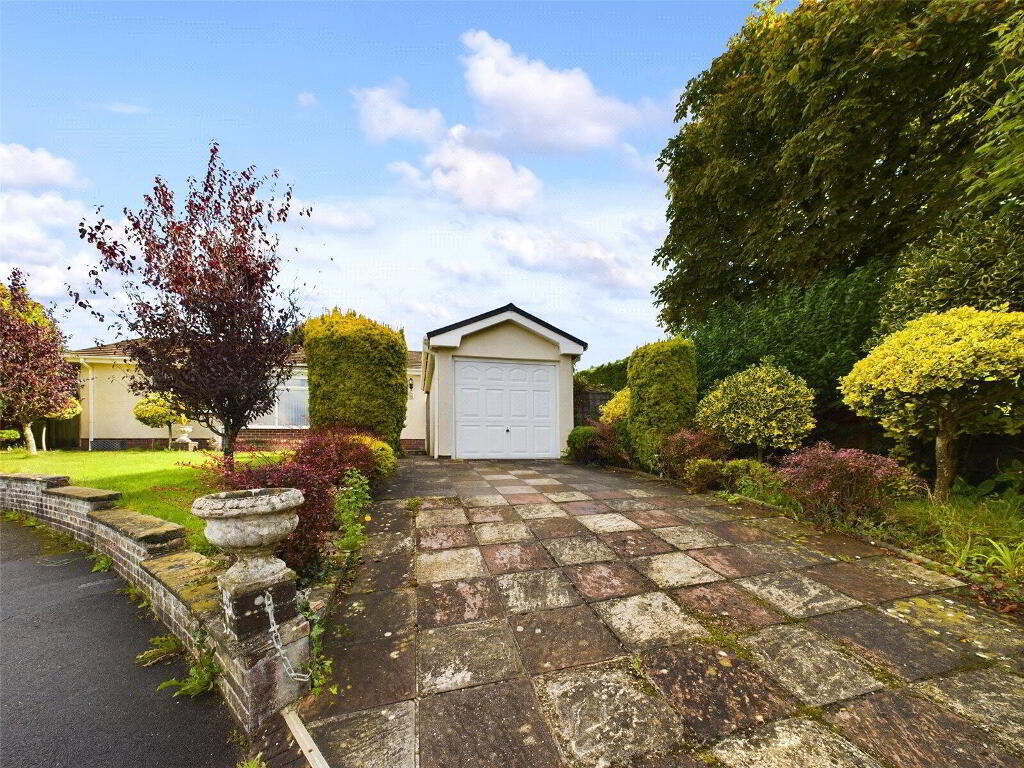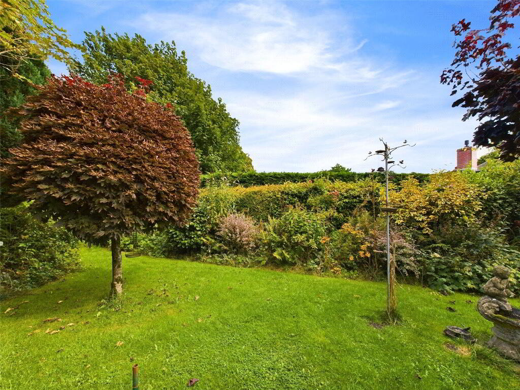 The property is approached via a private drive, providing off road parking for 2 vehicles and giving access to the detached single garage. A paved path leads to the front entrance porch. The front garden is principally laid to lawn and decorated with a variety of mature trees and shrubs. Access down both sides of the property leads to the enclosed and private rear garden which is laid to lawn and landscaped with a range of trees and shrubs. The rear garden is bordered by mature hedges and a brick wall.