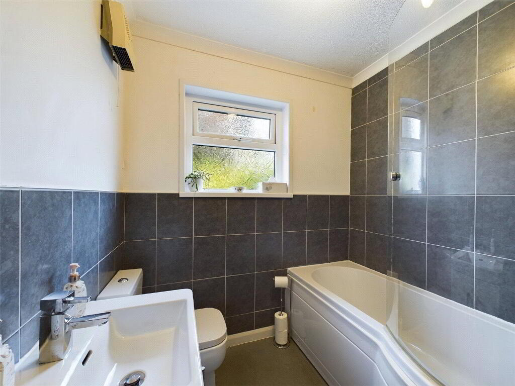 A fitted suite comprising a "P" shape bath with a mains fed shower attachment over, vanity unit with inset wash hand basin, low flush WC and heated towel rail. Frosted window to rear elevation.