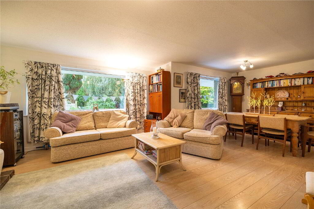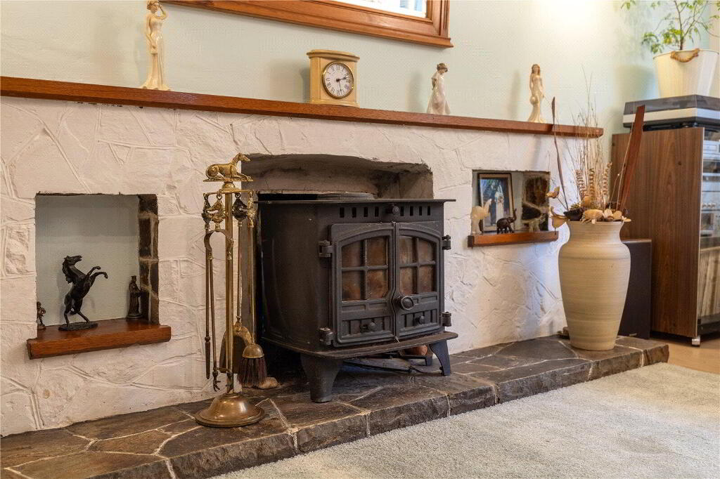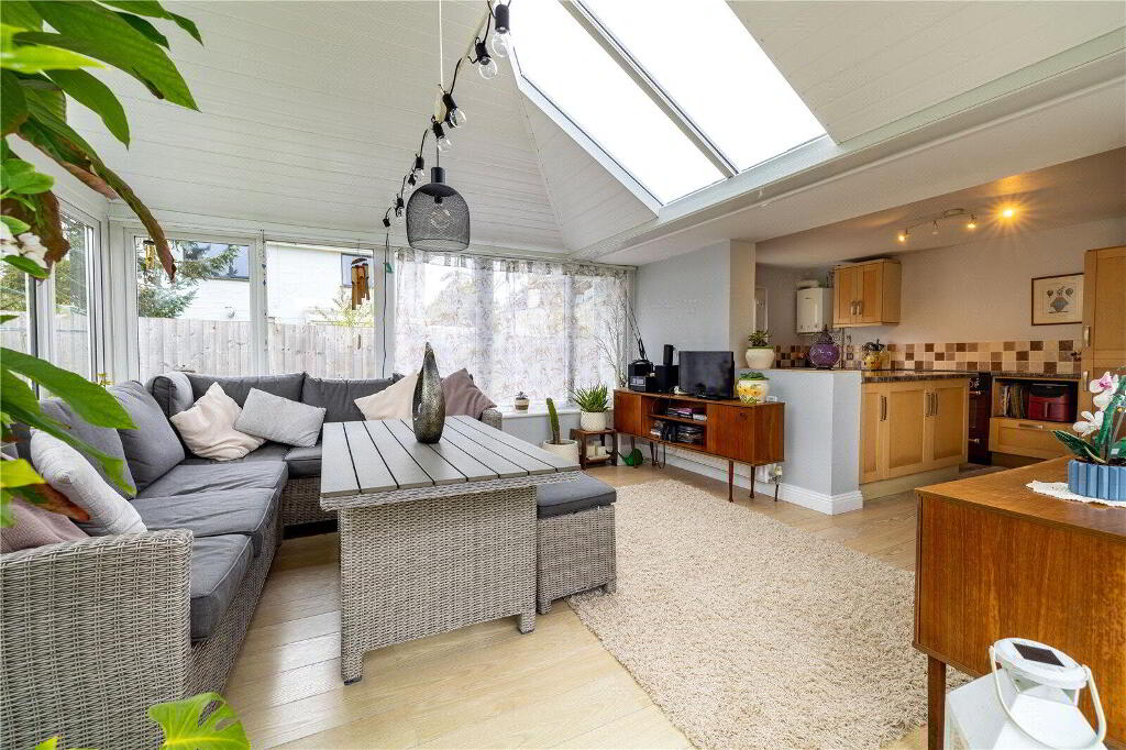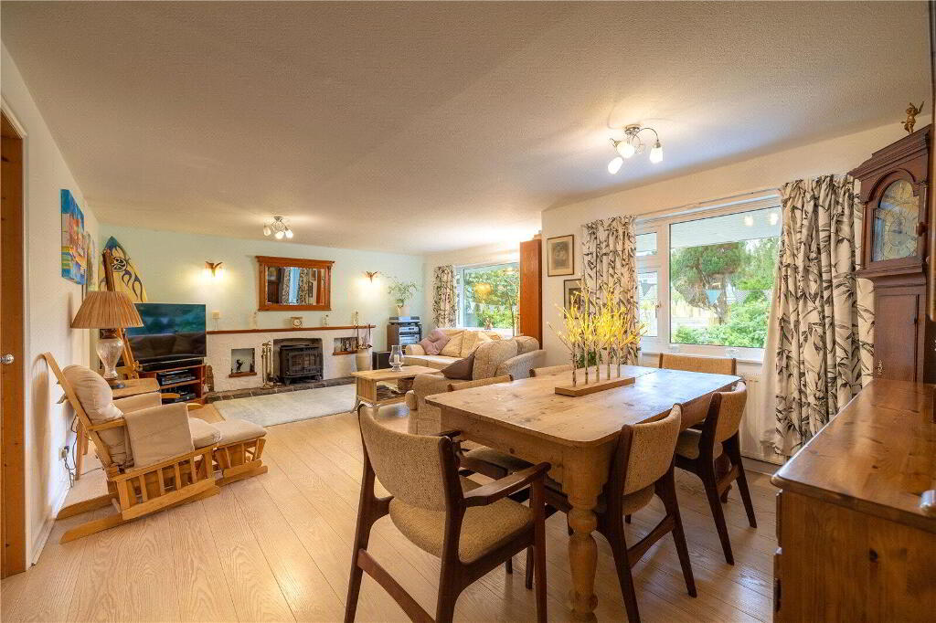 Inside, the home welcomes you with a bright and airy Entrance Hall featuring double-width fitted storage. The expansive Lounge / Dining Room boasts a double aspect, allowing for plenty of natural light and showcasing lovely views to the front. A wood-burning stove serves as a focal point, and there is ample room for a large dining table and chairs, making it an ideal space for entertaining. The fitted Kitchen includes an L-shaped breakfast bar, an electric range cooker, and flows semi-open-plan into the Conservatory.