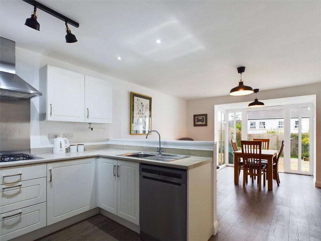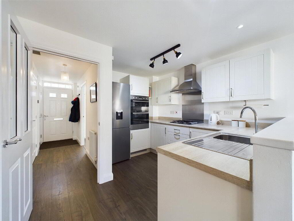 Step inside and you’re welcomed by a bright, airy entrance hall leading into a contemporary open-plan kitchen/diner, French doors flood the space with natural light and open directly onto a stunning rear garden—a private sun-soaked haven that wraps around the back of the generously sized garage.