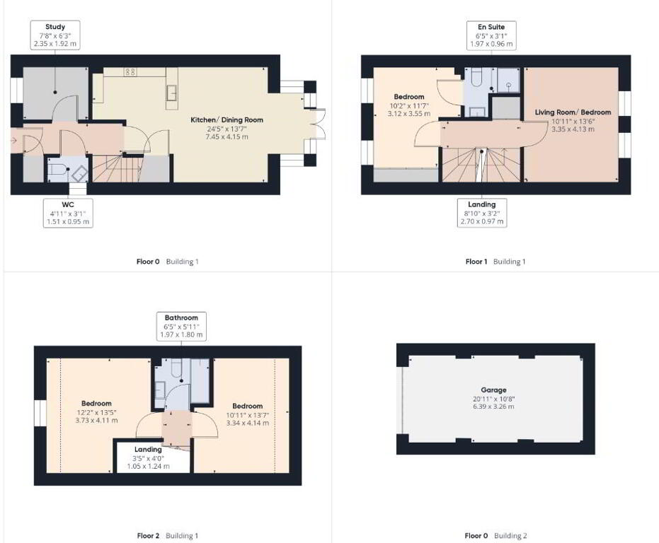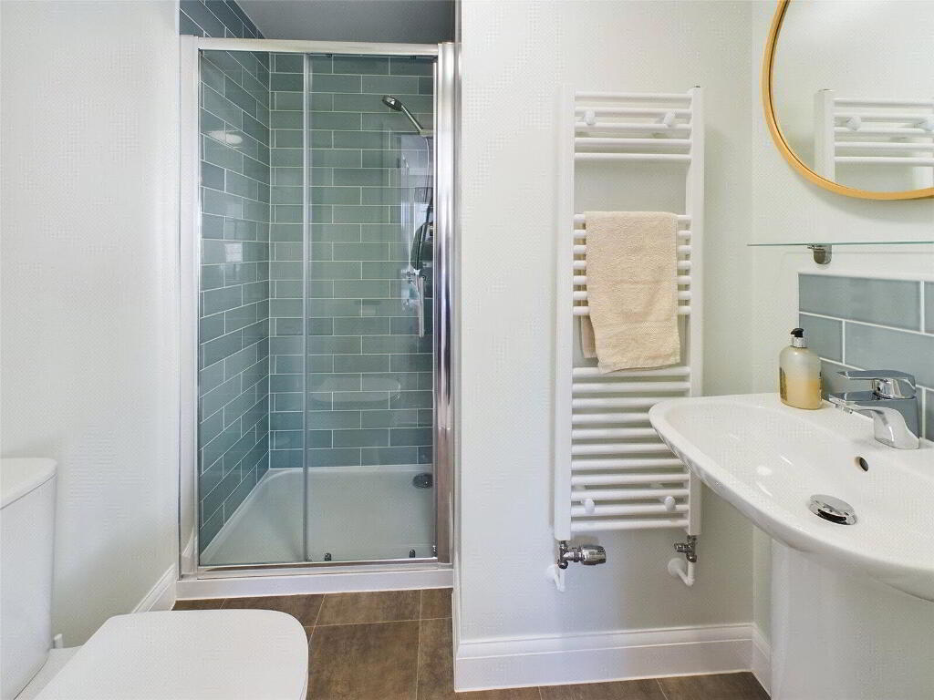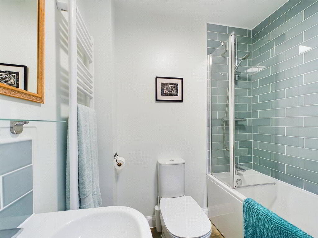 Upstairs on the first floor, you’ll find a light-filled living room, which can easily double as an additional double bedroom, depending on your needs. Across the hall is a spacious double bedroom with built-in wardrobes and its own sleek en-suite.