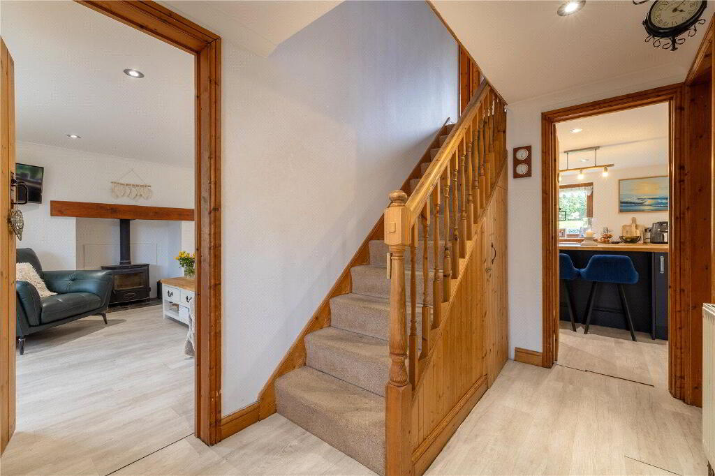 Luxury vinyl tiled flooring, radiator. Carpeted stairs rising to First Floor with understairs storage cupboard.