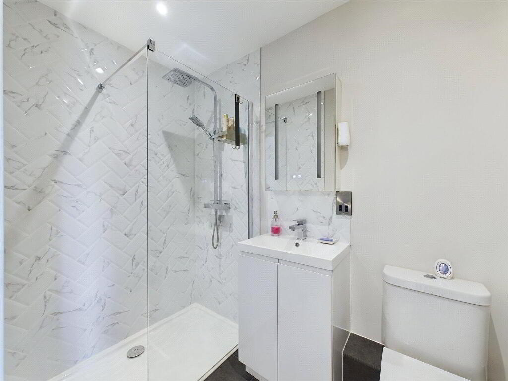 A matching suite comprising a large, walk in shower cubicle with mains fed shower attachment over, low flush WC, heated towel rail, vanity unit with inset wash hand basin, mixer tap and illuminating mirror over. - Bedroom 3