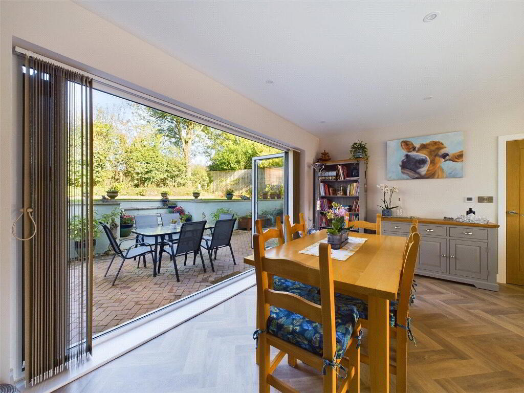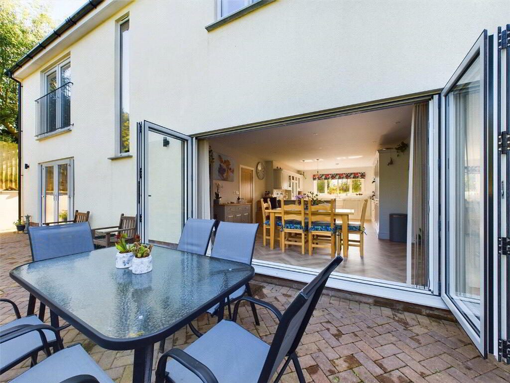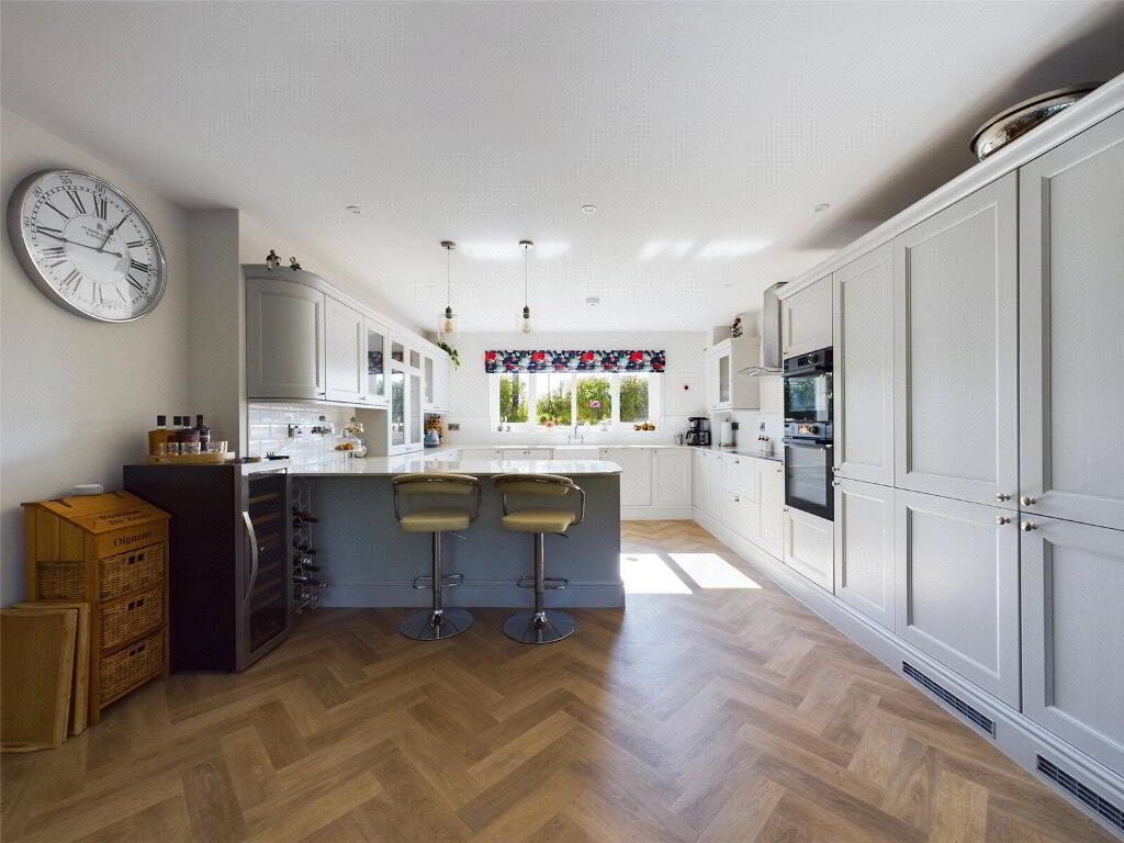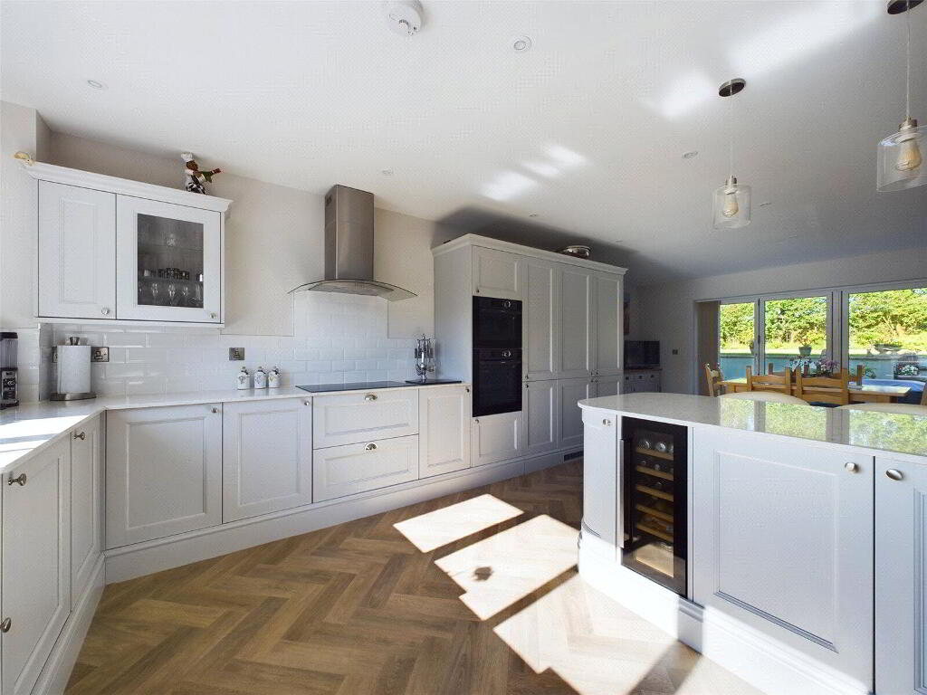 A stunning, high quality kitchen comprises a range of base and wall mounted units with work surface over, incorporating a feature "Belfast" sink with mixer taps. Built in eye level, double electric oven, 5 ring hob with extractor over. Integrated appliances include fridge/freezer, dishwasher and wine cooler. Feature breakfast bar, with ample space for separate dining table and chairs. Bi-folding doors to rear, with views of the garden and window to front elevation. - Living Room