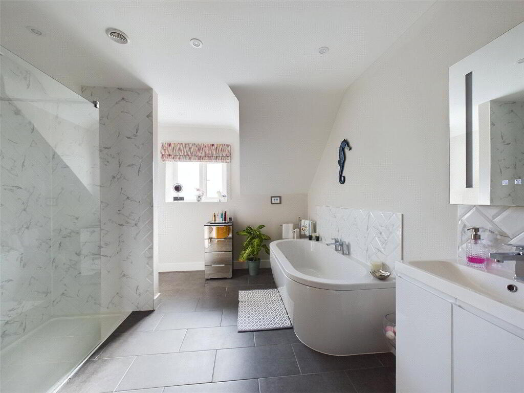 A four piece suite comprising large shower cubicle with mains fed shower over, separate bath, Low flush WC, heated towel rail and vanity unit with inset wash hand basin, mixer tap and illuminating mirror over. Frosted window to front elevation. - Outside