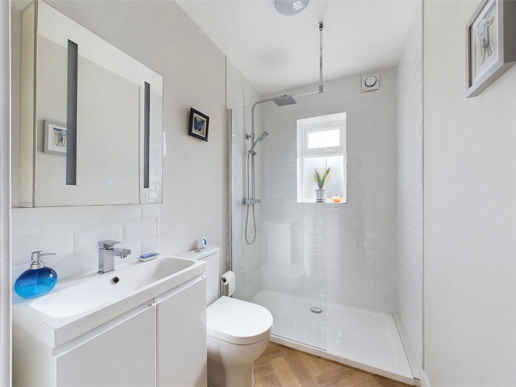 Fitted with a matching white suite comprising large shower cubicle with mains fed shower over, low flush WC, vanity unit with inset wash hand basin, mixer tap and illuminating mirror over. Frosted window to front elevation. - Utility Room