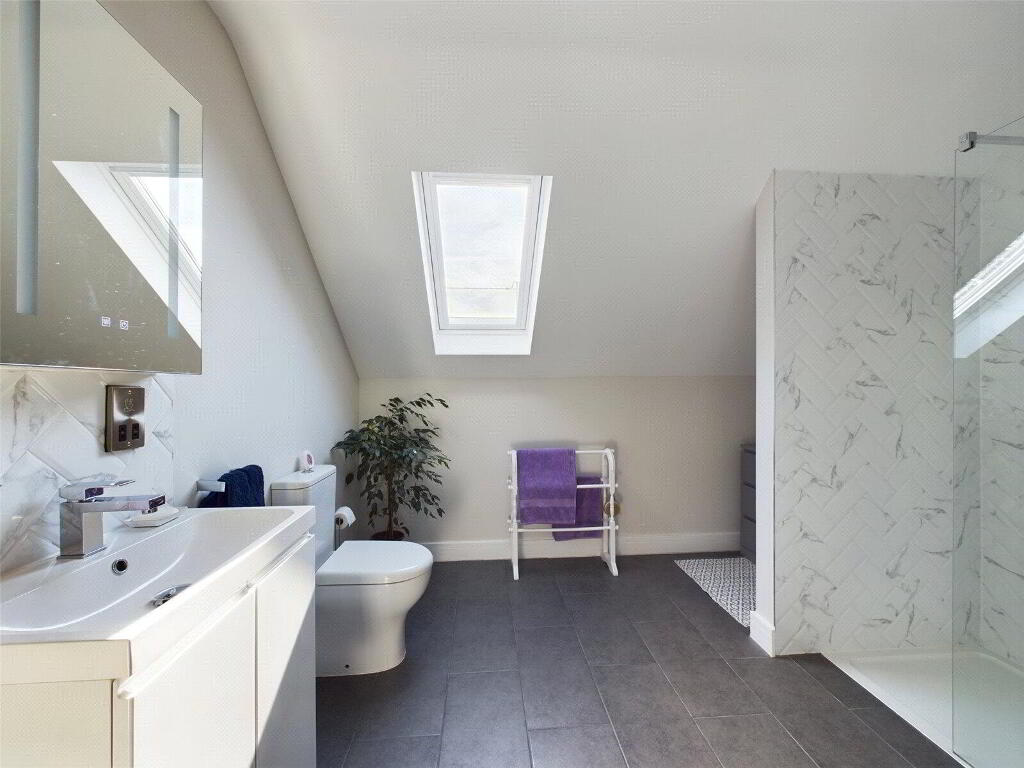 A fitted suite comprising large walk in shower cubicle with mains fed shower over, vanity unit with inset wash hand basin, mixer tap and illuminating mirror over, low flush WC and heated towel rail. Access to useful storage cupboard. Velux window to front elevation. - Bedroom 2