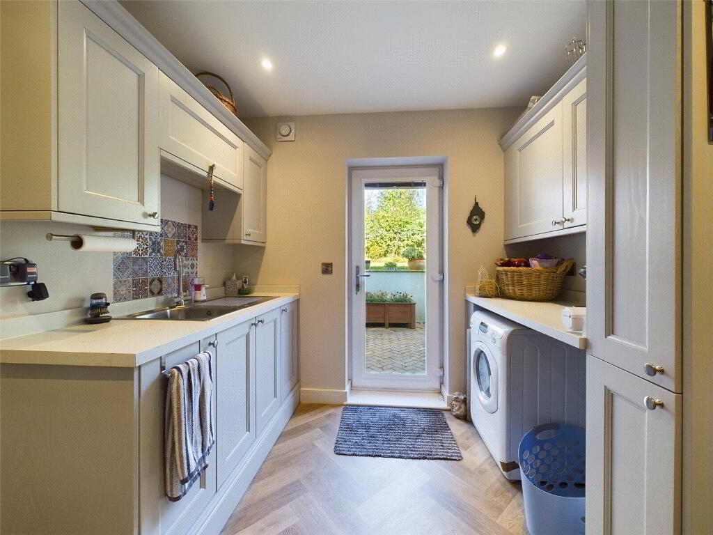 Fitted with a range of matching wall and base mounted units with work surfaces over, incorporating a stainless steel sink drainer unit with mixer tap. Space and plumbing for washing machine and tumble dryer. Access to plant room and the integral garage. External door to rear, leading to the garden. - Plant Room