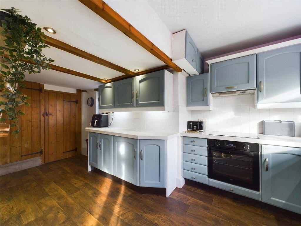 To the rear, the cottage opens into a bright dining area bathed in natural light from large windows that overlook the peaceful garden. This space offers the perfect setting for family meals or entertaining guests, with contemporary light fixtures adding a sleek touch. The adjoining kitchen has been tastefully updated, offering a perfect balance of style and practicality for those who enjoy cooking.