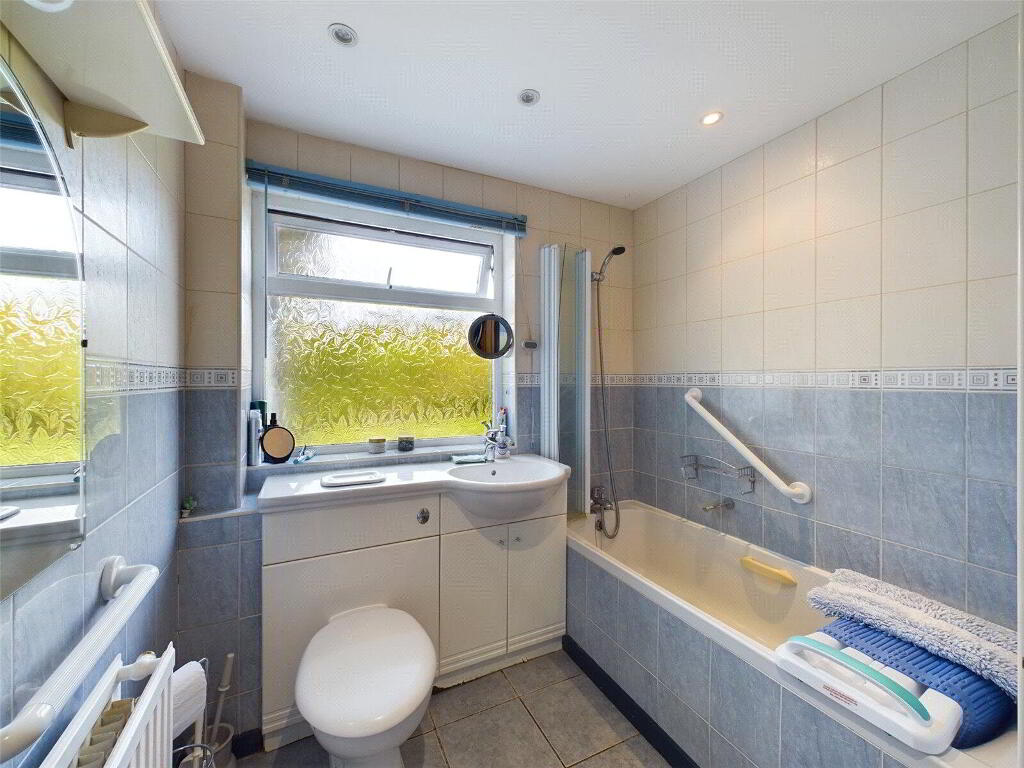 Vanity unit with inset wash hand basin and concealed cistern WC, Panel bath with mixer taps and shower attachment. Heated towel rail. Opaque double glazed window to rear elevation. Built in airing cupboard housing pressurised hot water cylinder.