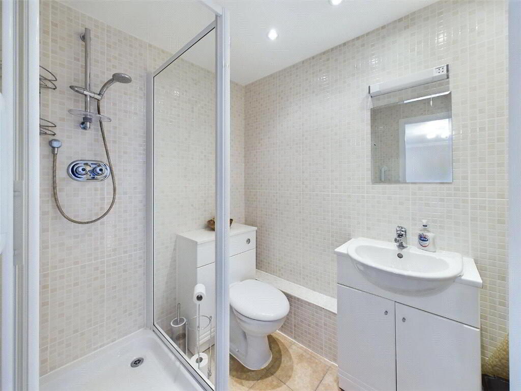 Enclosed shower cubicle with mains fed shower over, low flush WC, vanity unit wash hand basin, heated towel rail.