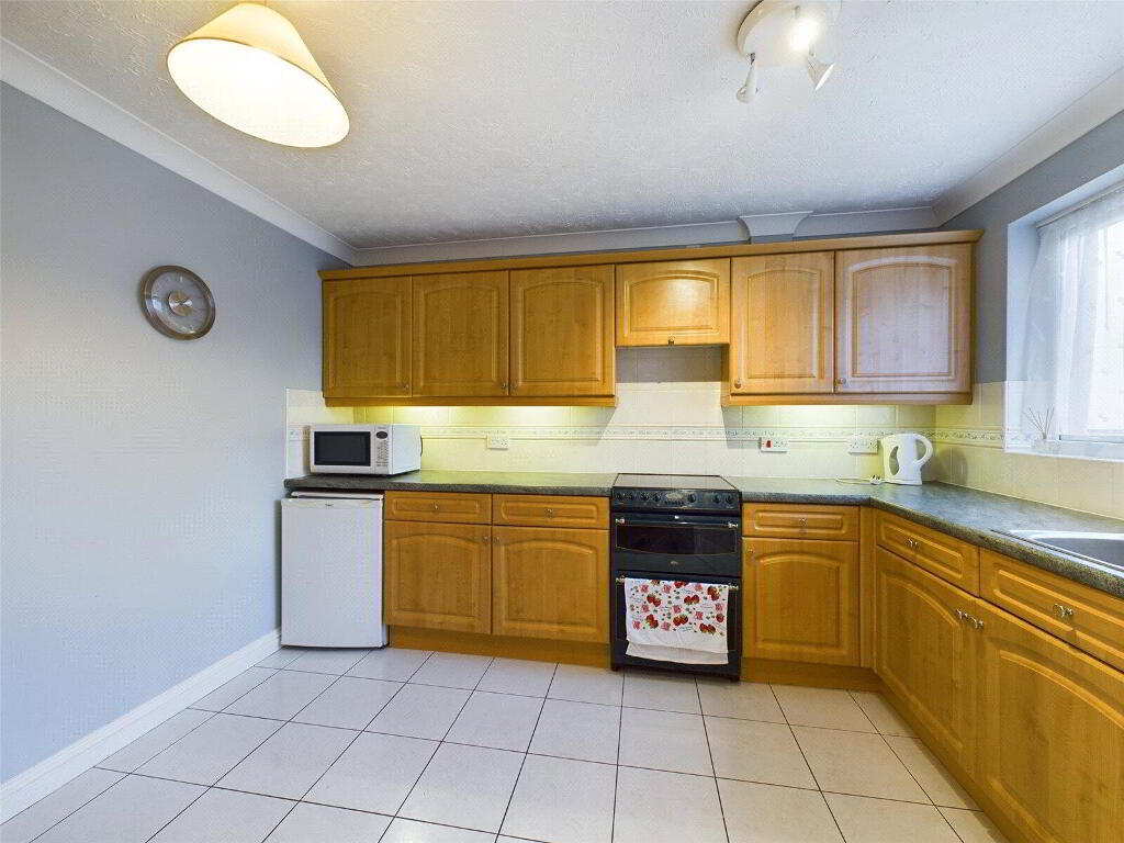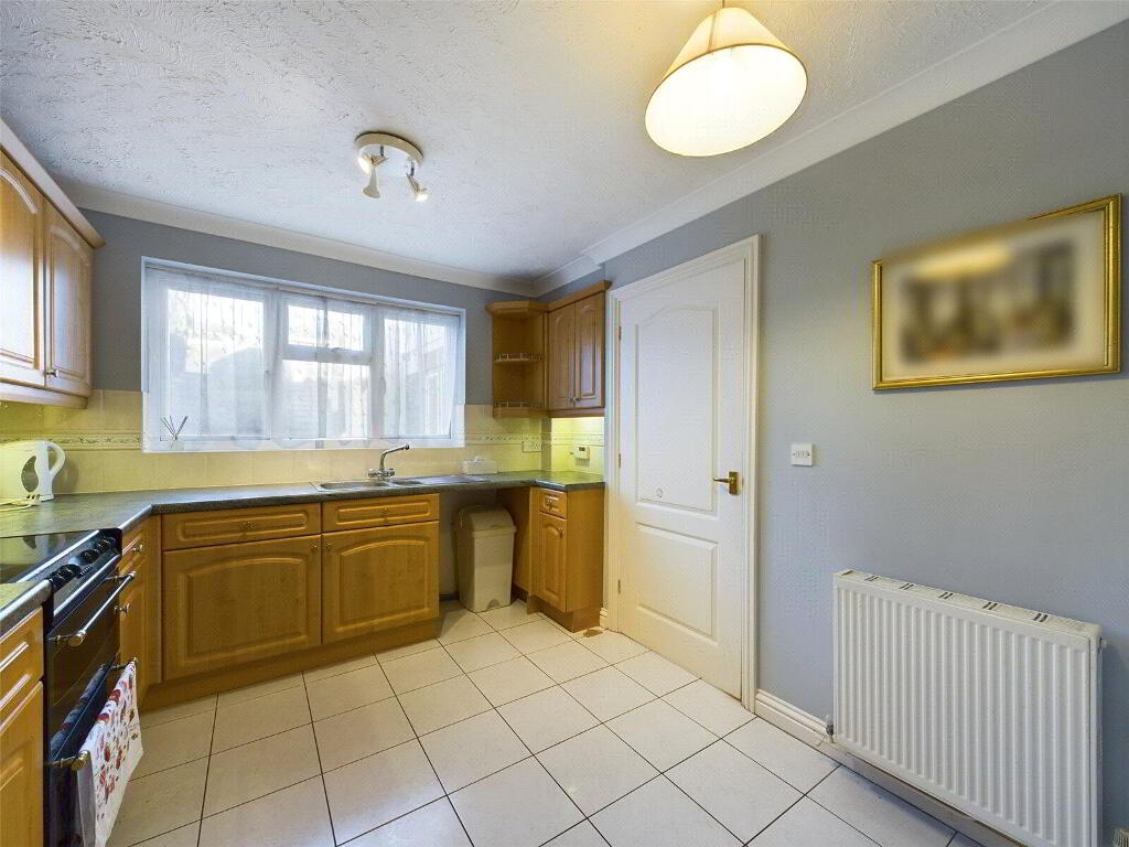 A fitted kitchen comprising a range of matching wall and base units with worksurfaces over, incorporating a stainless steel 1 1/2 sink drainer unit with mixer tap. Space for electric oven with extractor over, under counter fridge and washing machine. Room for dining table and chairs. Window to front elevation.