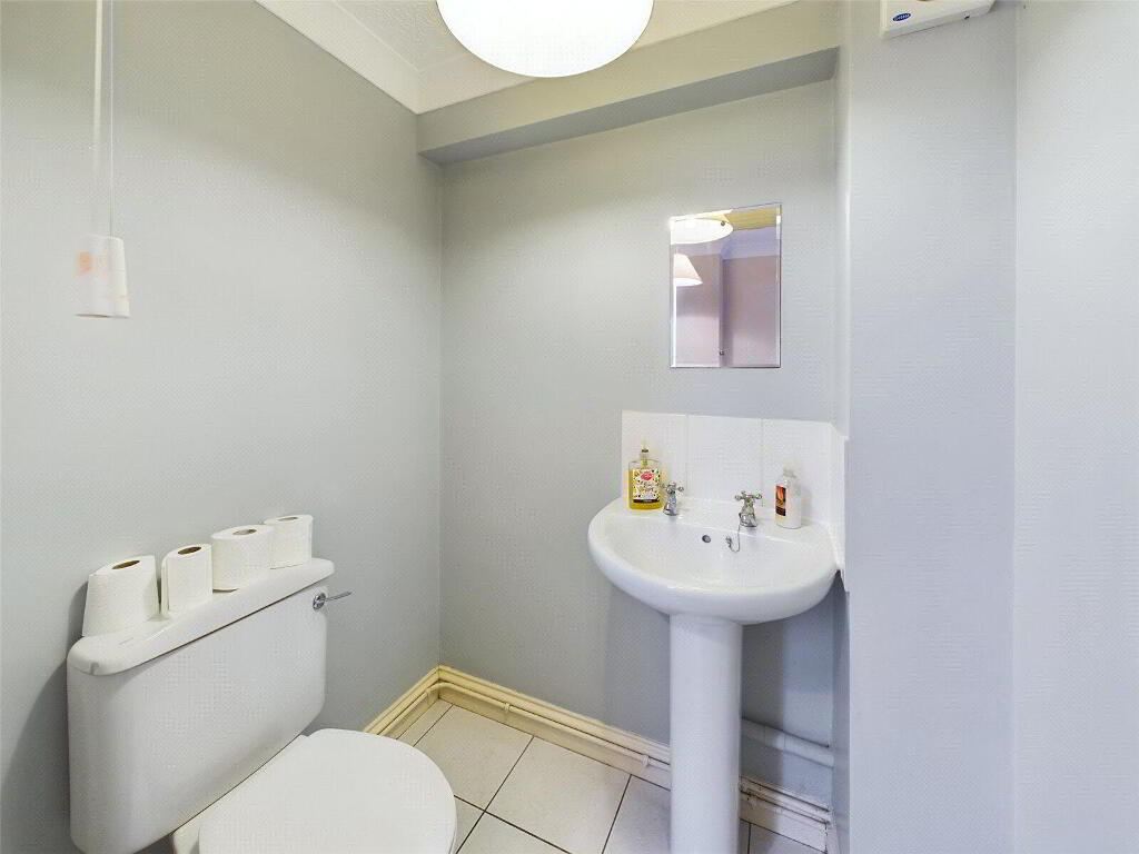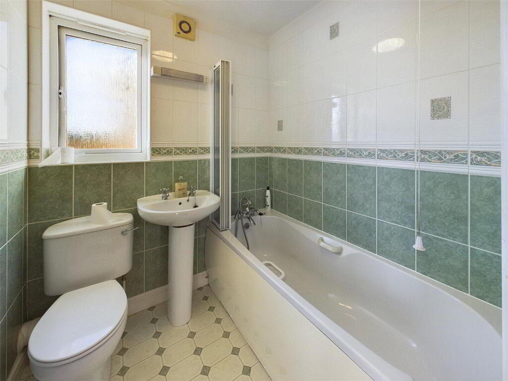 A fitted suite comprises an enclosed panelled bath, close coupled WC and wash hand basin. Frosted window.