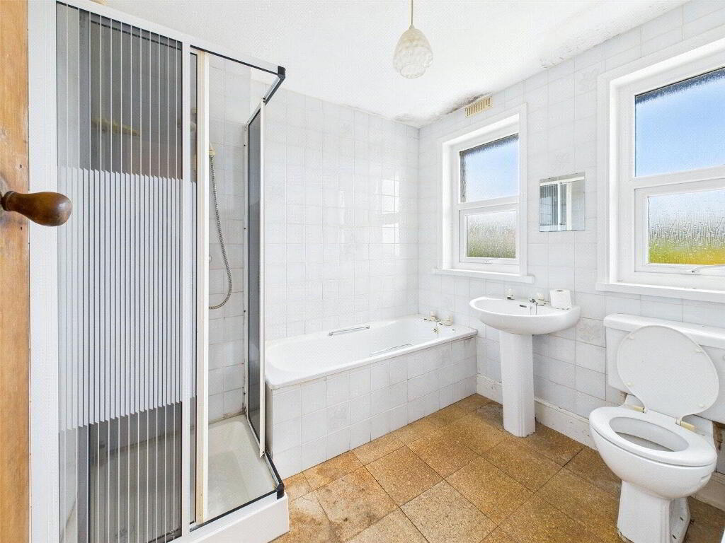 Comprising of an enclosed panel bath with mixer taps over, enclosed shower cubicle with mains fed shower over, low level WC and pedestal hand wash basin. Frosted window to rear elevation.