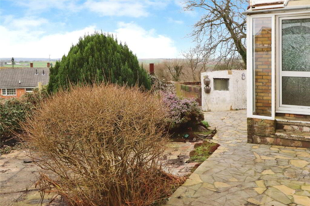 The property features low-maintenance front gardens bordered by hedges and fencing, complemented by a crazy-paved driveway providing off-road parking and leading to a Detached Single Garage. The paving extends along the side of the bungalow, offering additional outdoor space, while the rear garden maximises the scenic views.