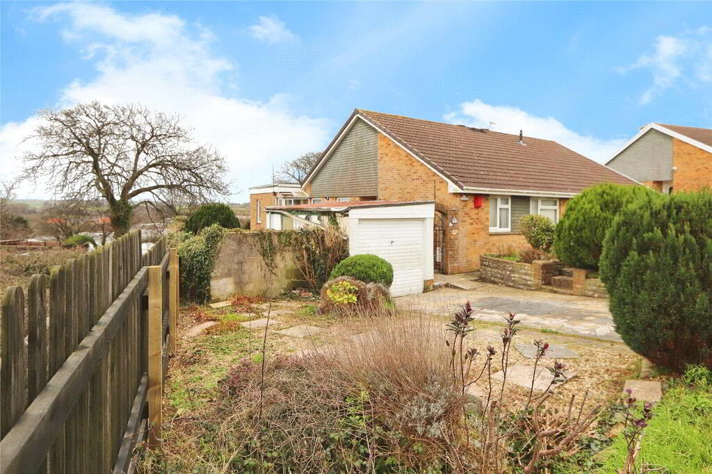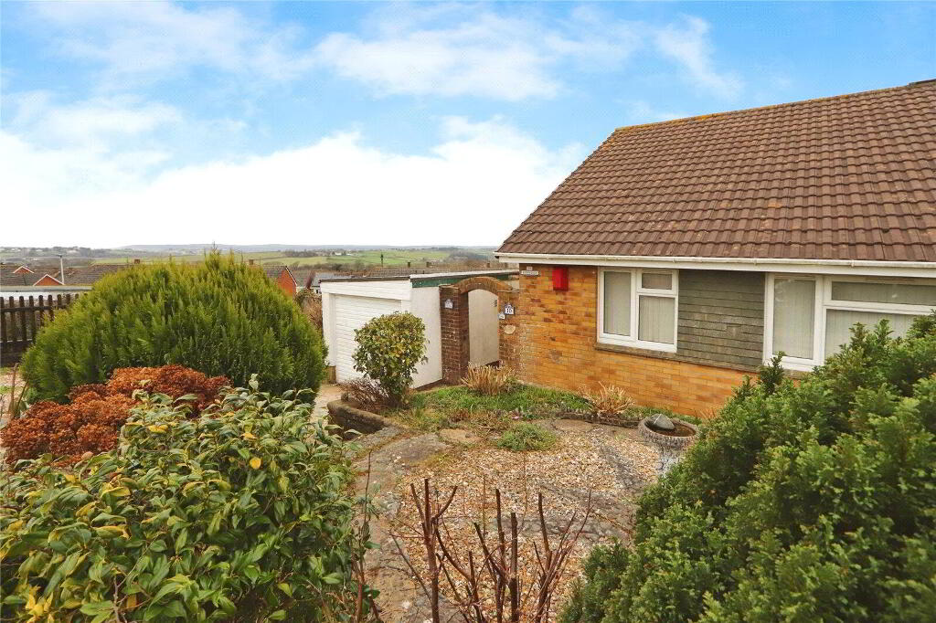 Spacious 2-bed semi-detached bungalow in Bideford with stunning countryside views, a sea glimpse, detached garage, driveway, large living room, dining room, and no onward chain—ideal for modernisation.