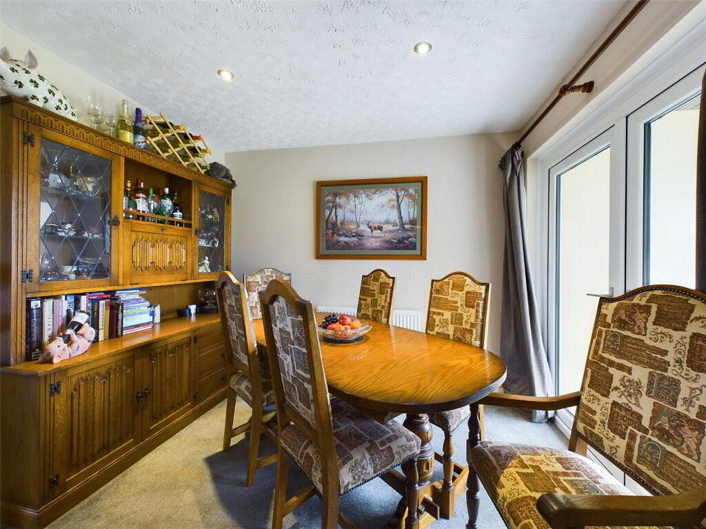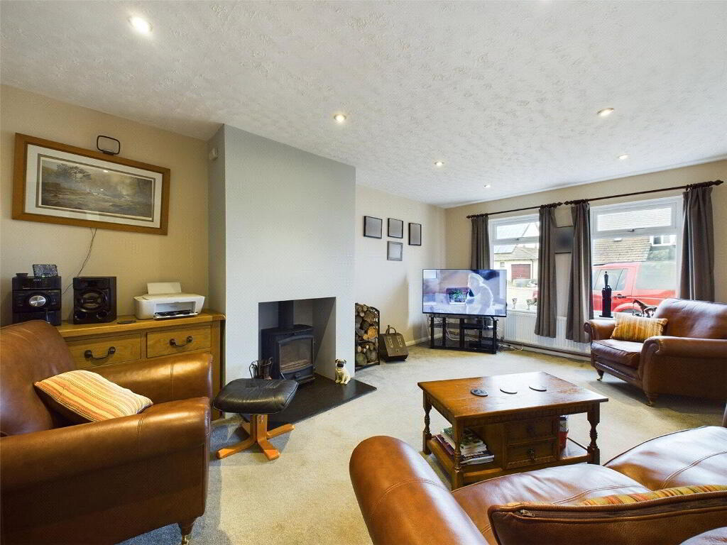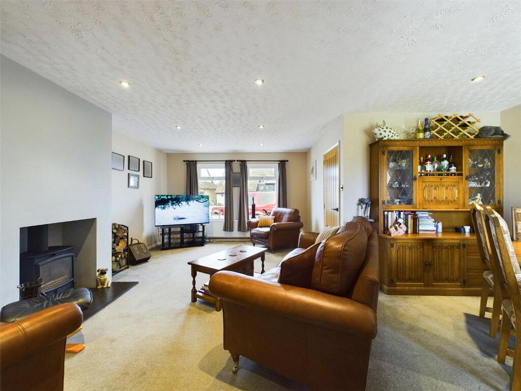 A spacious room with ample space for a living room suite and a dining room table and chairs. A feature fireplace with a slate hearth, houses a wood burning stove. Window to front and French glazed double doors to rear.