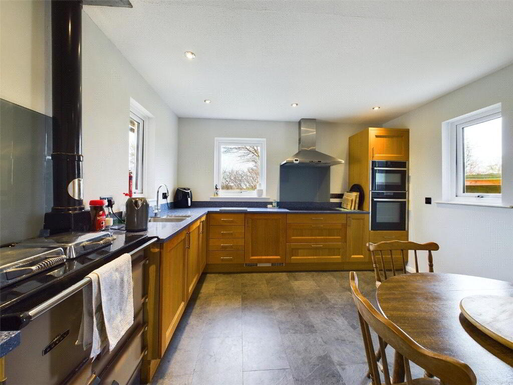 A well presented kitchen comprises a matching range of base and wall mounted units with work surfaces over, incorporating an inset 1 1/2 steel sink with mixer taps over. Range cooker. Built in high level double oven and countertop 5 ring ceramic hob. Built in fridge. Space for breakfast table and chairs. Window to rear elevation enjoy a pleasant aspect over the garden and the countryside beyond.