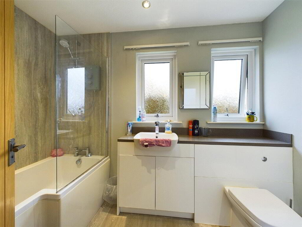 A superbly presented fitted suite comprises an enclosed panelled 'P' bath with power shower over. Vanity unit with concealed cistern WC and inset wash hand basin. Tall storage unit. Window to side.
