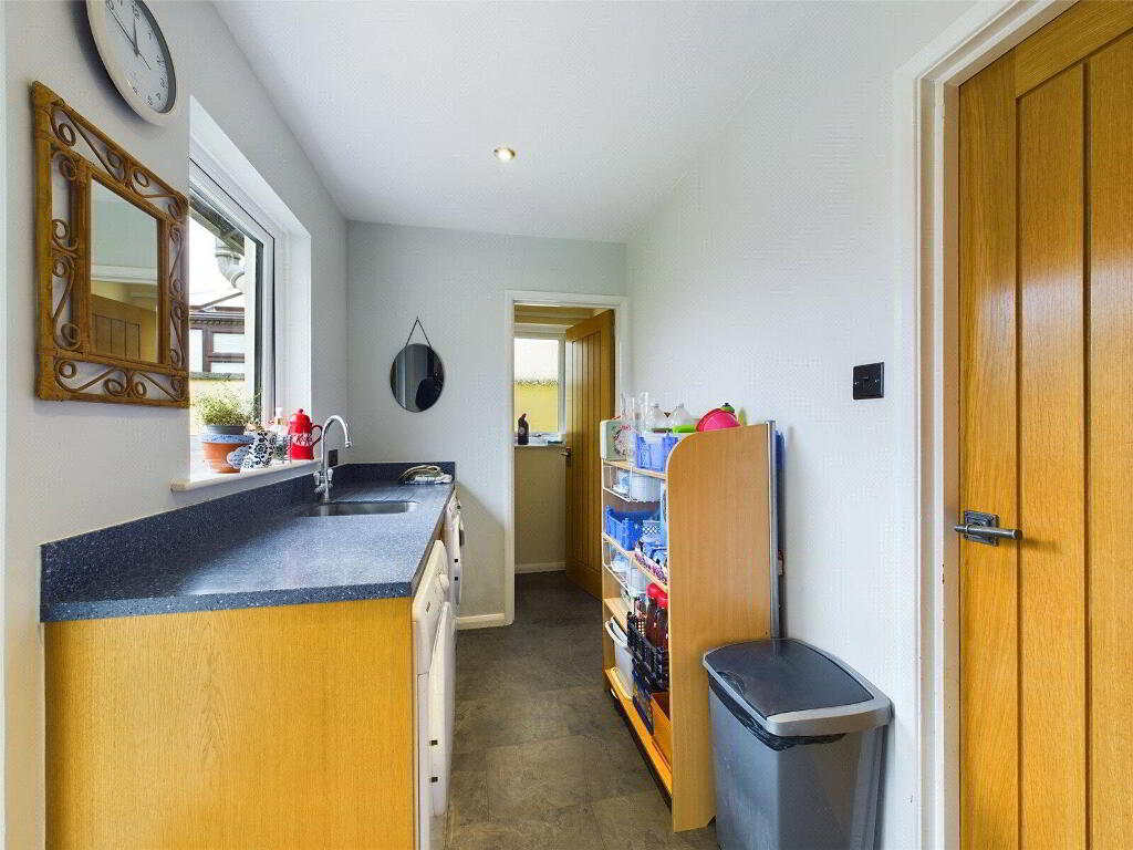 Base mounted units with work surfaces over, with an inset stainless steel sink unit. Plumbing and recess for washing machine and tumble dryer. Window and door to rear elevation.
