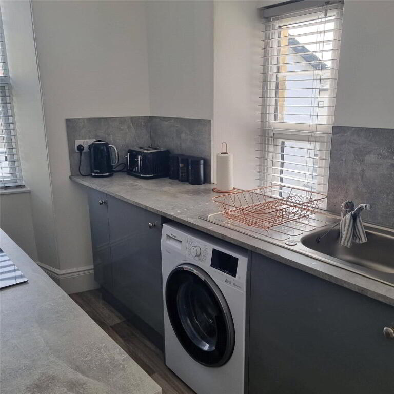 A modern fitted kitchen with a range of base and wall mounted units with inset stainless steel sink drainer unit with mixer taps, 4 ring electric hob with extractor over, built in oven, space and plumbing for washing machine. Dual aspect windows to front and side elevation overlooking the River Neet.