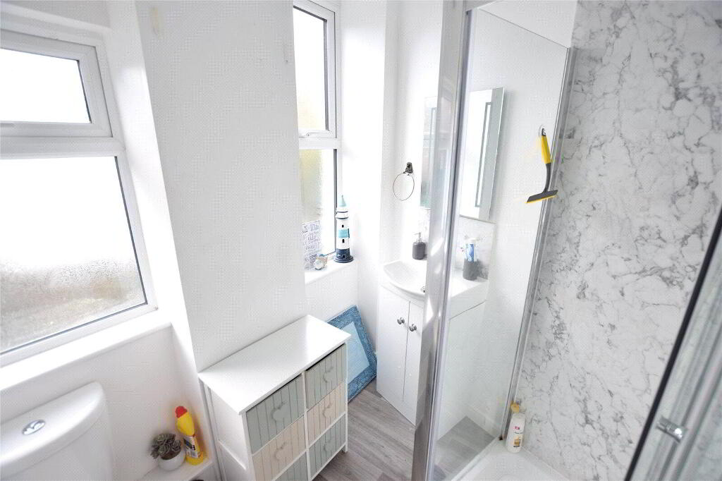 Enclosed shower cubicle with electric shower over, vanity unit with wash hand basin, low flush WC, windows to rear elevation.