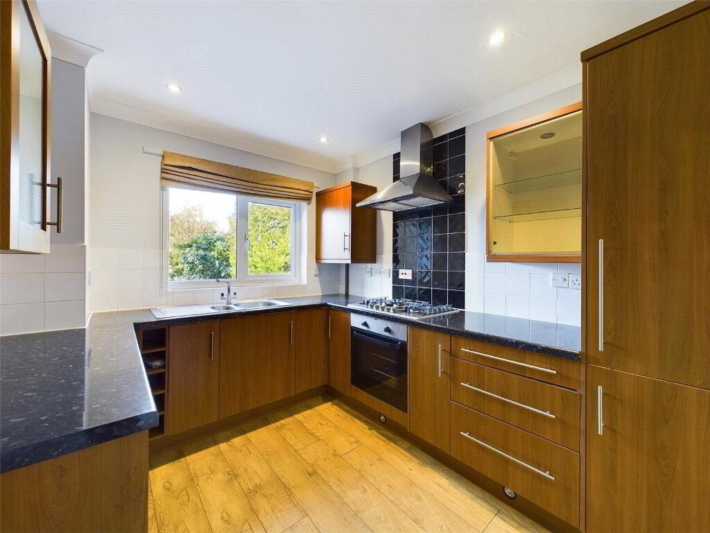 A fitted range of base and wall mounted units with work surfaces over incorporating inset stainless steel 1 1/2 sink drainer unit with mixer tap, built in 5 ring gas hob with extractor over and integrated oven. Space and plumbing for washing machine and tumble dryer with recess for tall fridge freezer. Window to front elevation. - WC