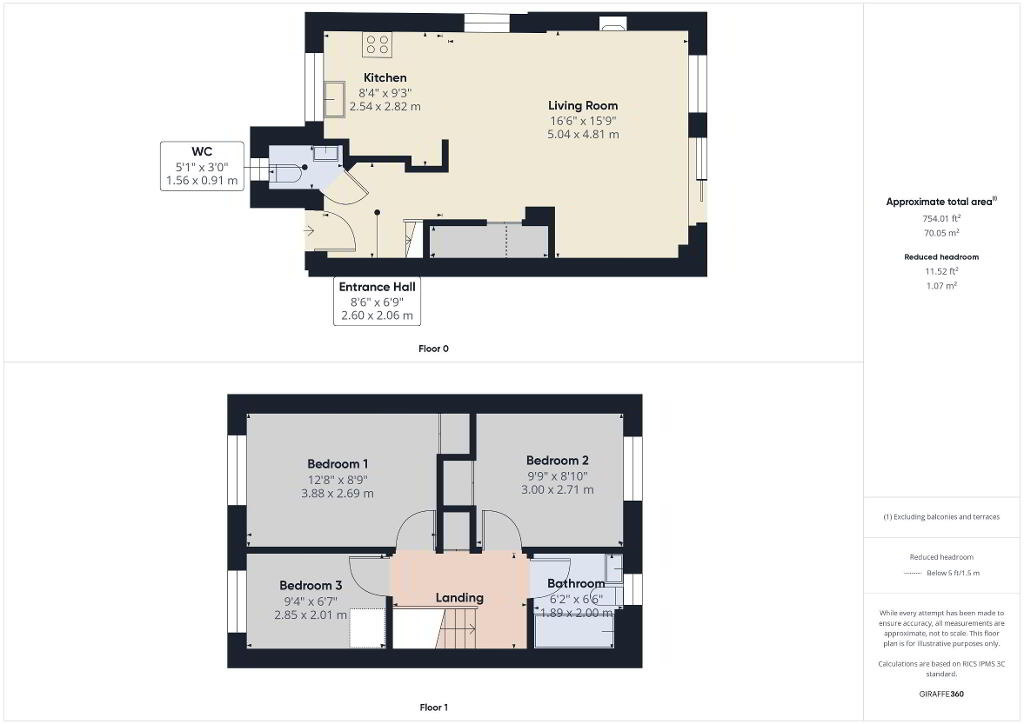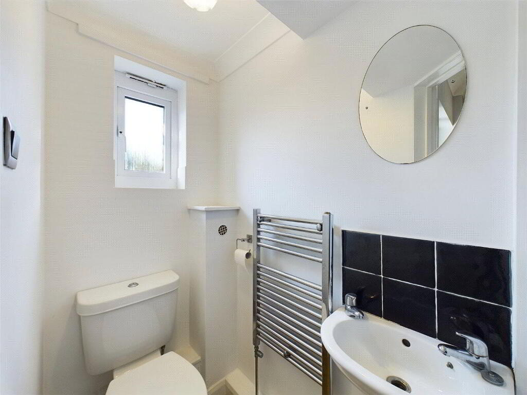 Low flush WC, wall hung wash hand basin, heated towel rail. Opaque glazed window to the rear. - First Floor Landing