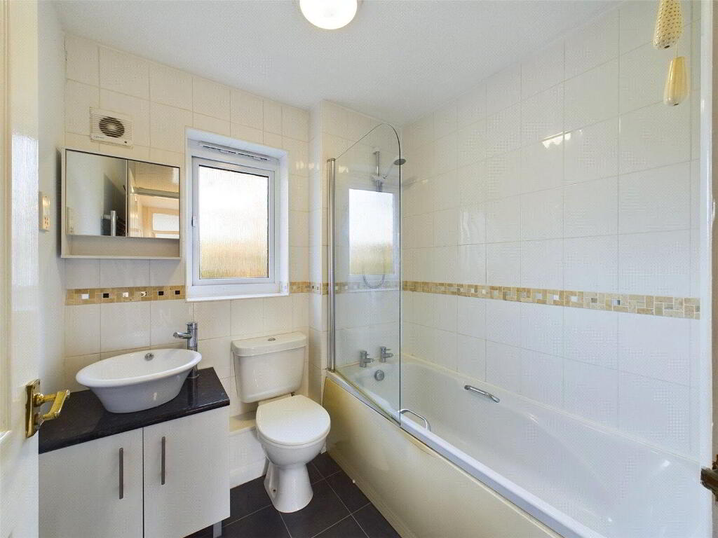 Enclosed panel bath with mixer taps and electric shower over, vanity unit with wash hand basin, low flush WC, heated towel rail and opaque glazed window to rear. - Outside