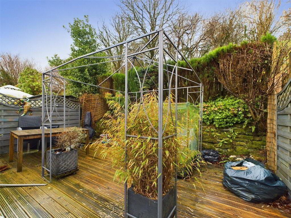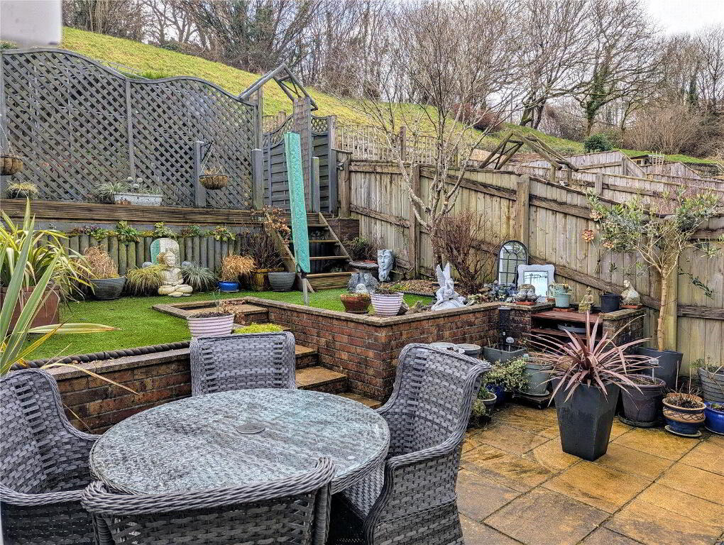 The tiered, low-maintenance garden includes an area of artificial turf and a decked seating area, ideal for outdoor relaxation or entertaining, all with scenic views toward Dartmoor.