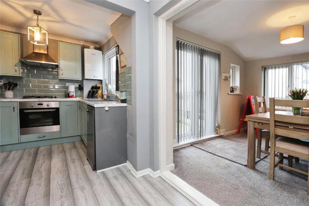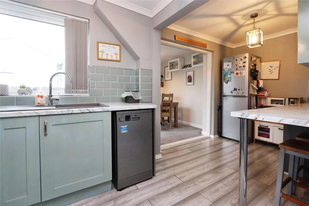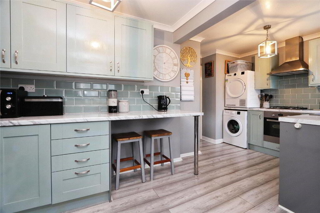 UPVC double glazed window to property rear. Modern stylish Kitchen fitted with a comprehensive range of eye and base level cupboards and drawers and inset sink and drainer with mixer tap set into marble effect rolltop work surface. Breakfast Bar. Large Larder cupboard. Built-in oven with 4-ring gas hob with extractor canopy over. Space for dishwasher, space for fridge / freezer, space and plumbing for washing machine and tumble dryer. Tiled splashback, laminate flooring. Opening through to Diner.