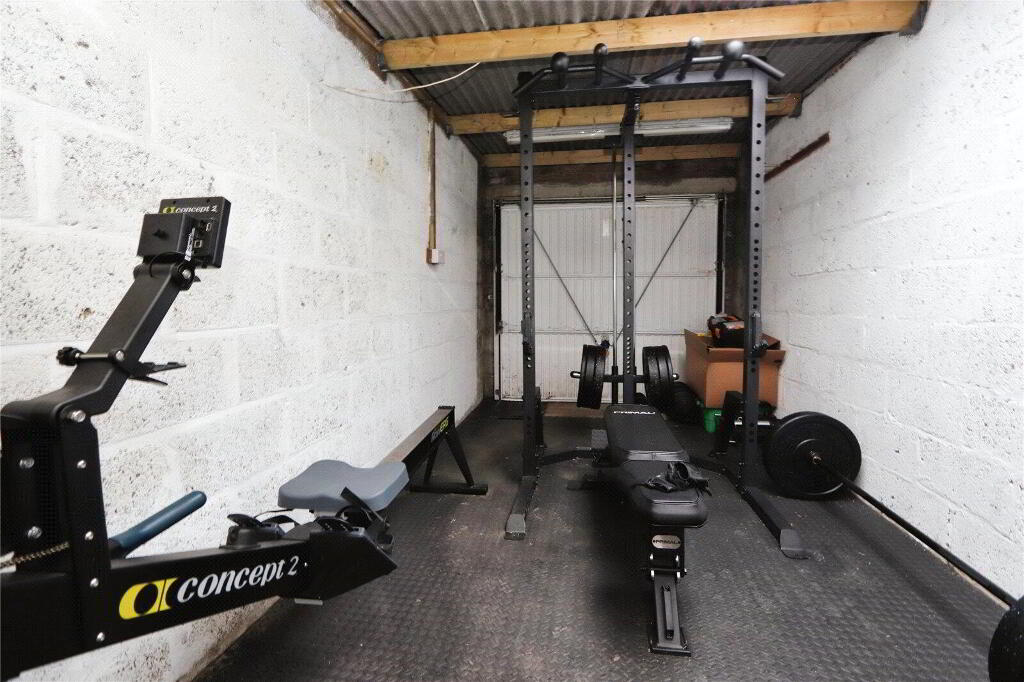 A useful outside space with up and over door. Currently divided into 2 useful spaces - the front area is used as a Gym and the rear area is used for storage and utility. Windows to rear and side elevations. Door to Cloakroom with low level WC and wall mounted wash hand basin with tiled splashback.