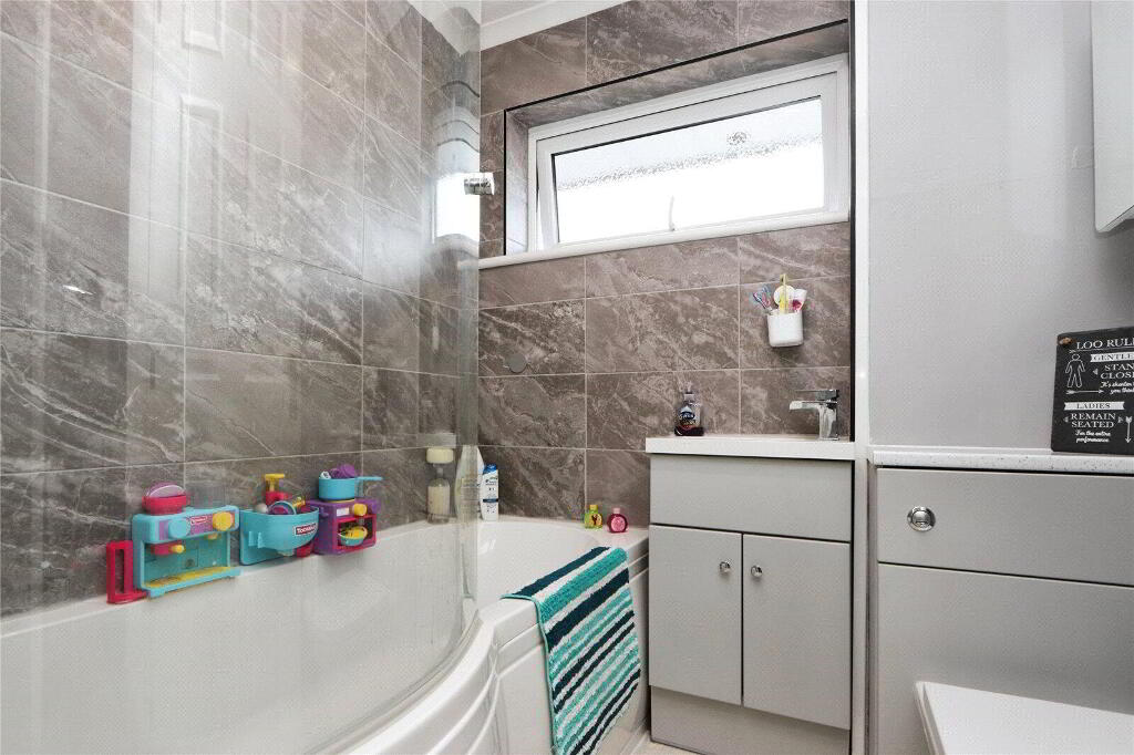 An attractive, contemporary Bathroom comprising 'P' shape bath with rainforest head shower over, hand shower attachment and fully tiled walls, cabinet mounted wash hand basin with tiled splashback, and low level WC. Heated towel rail, vinyl flooring.