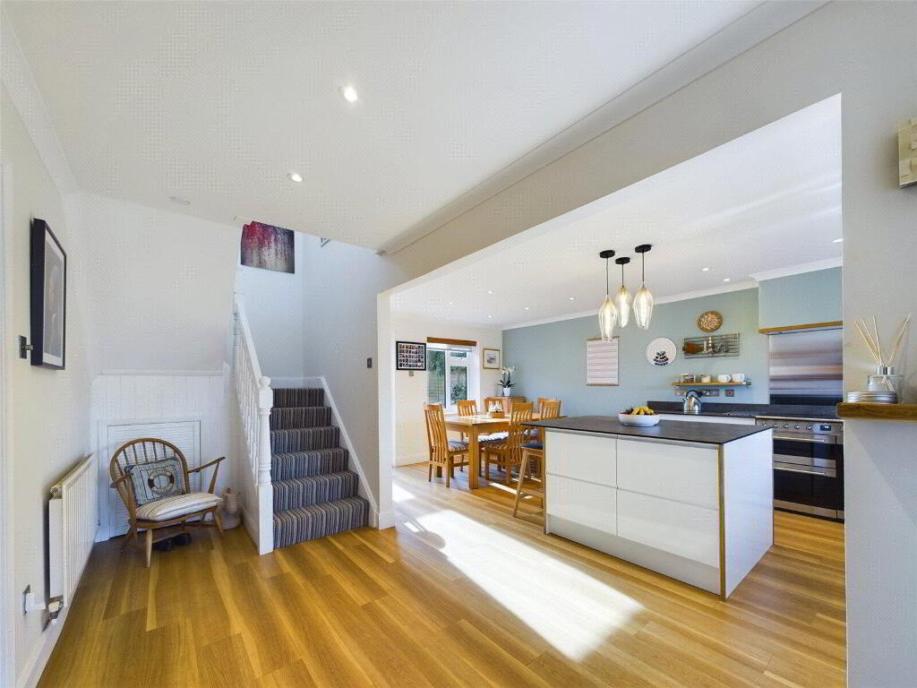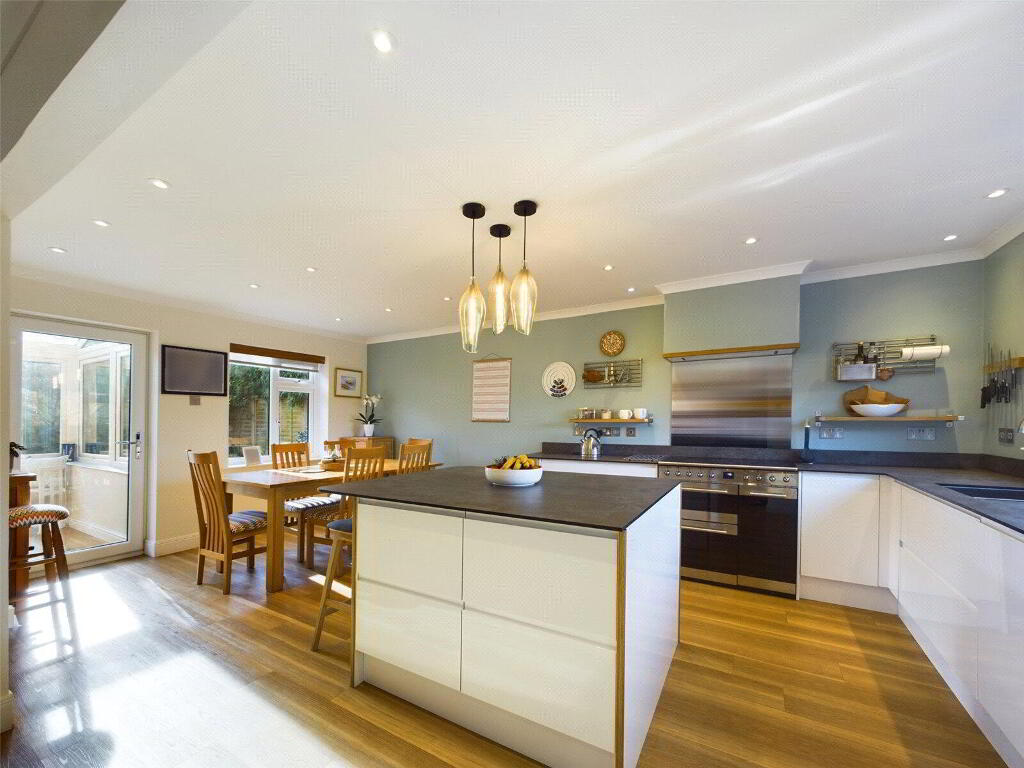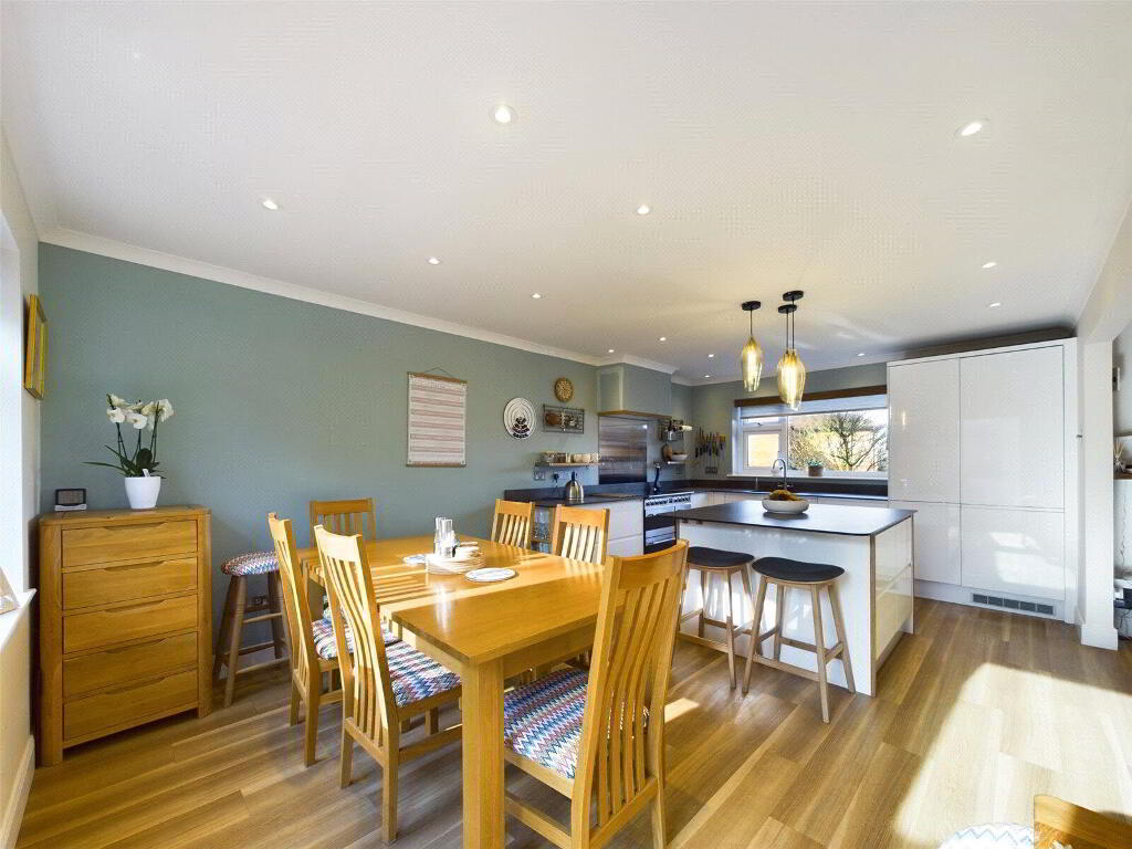 Upon entering, you are greeted by a stunning kitchen/dining area that has been thoughtfully designed to create a light and airy space, perfect for both cooking and entertaining. The recently fitted kitchen is both practical and stylish, featuring modern appliances, abundant worktop space, and a central island that adds a social element to the room. The adjacent dining area further enhances the space, making it an ideal spot for family meals or gatherings with friends. A sunroom located just off the kitchen offers a peaceful space to relax and enjoy the outdoors, no matter the weather.
