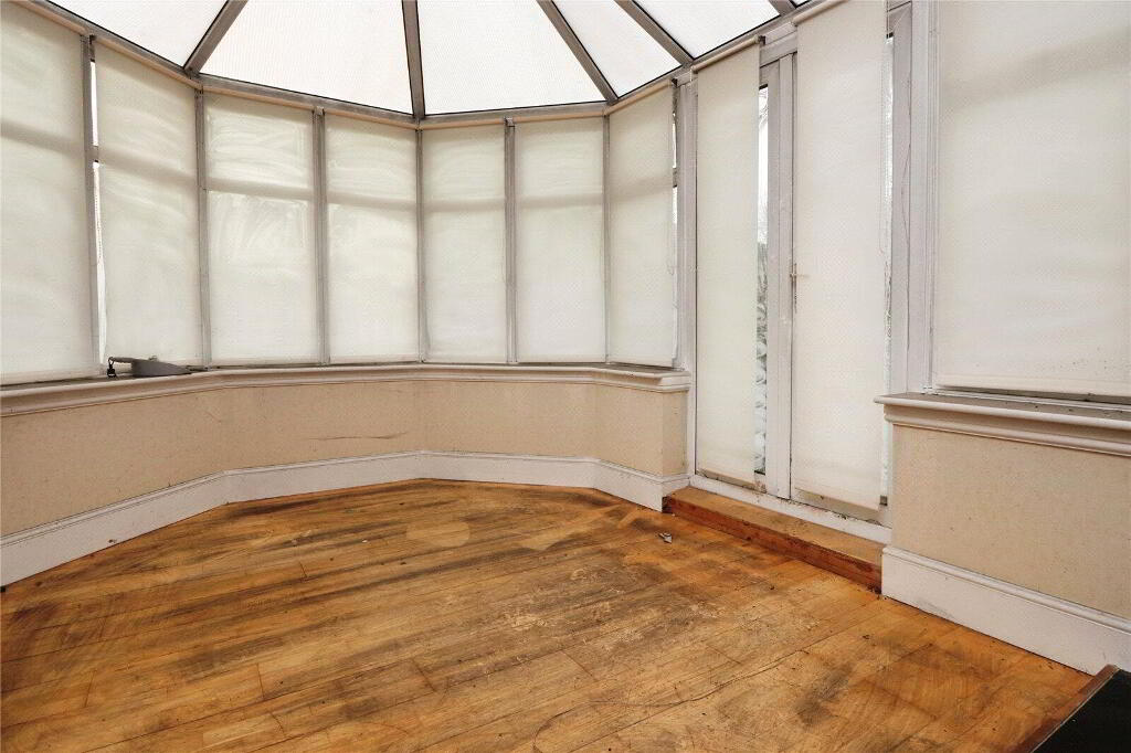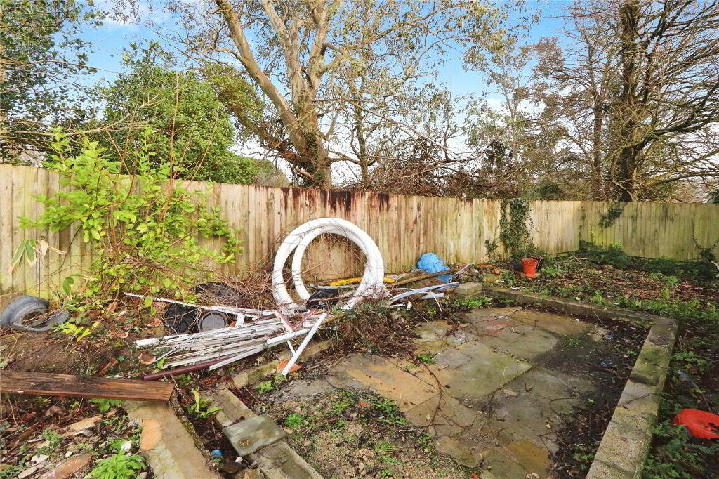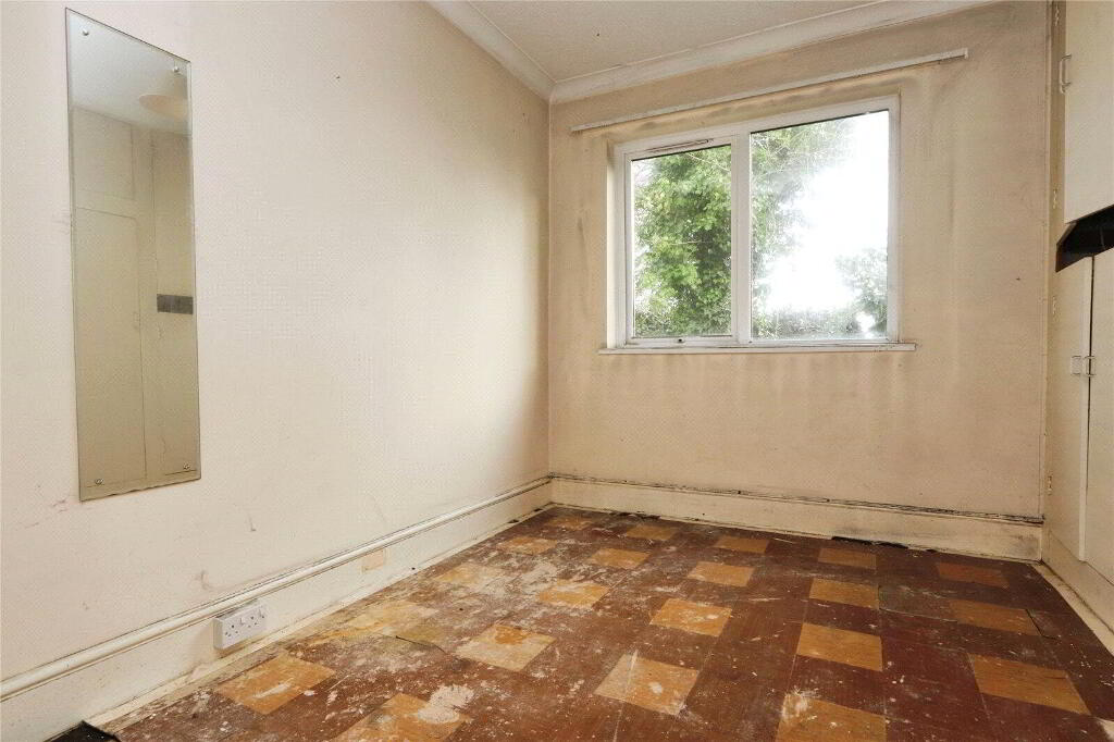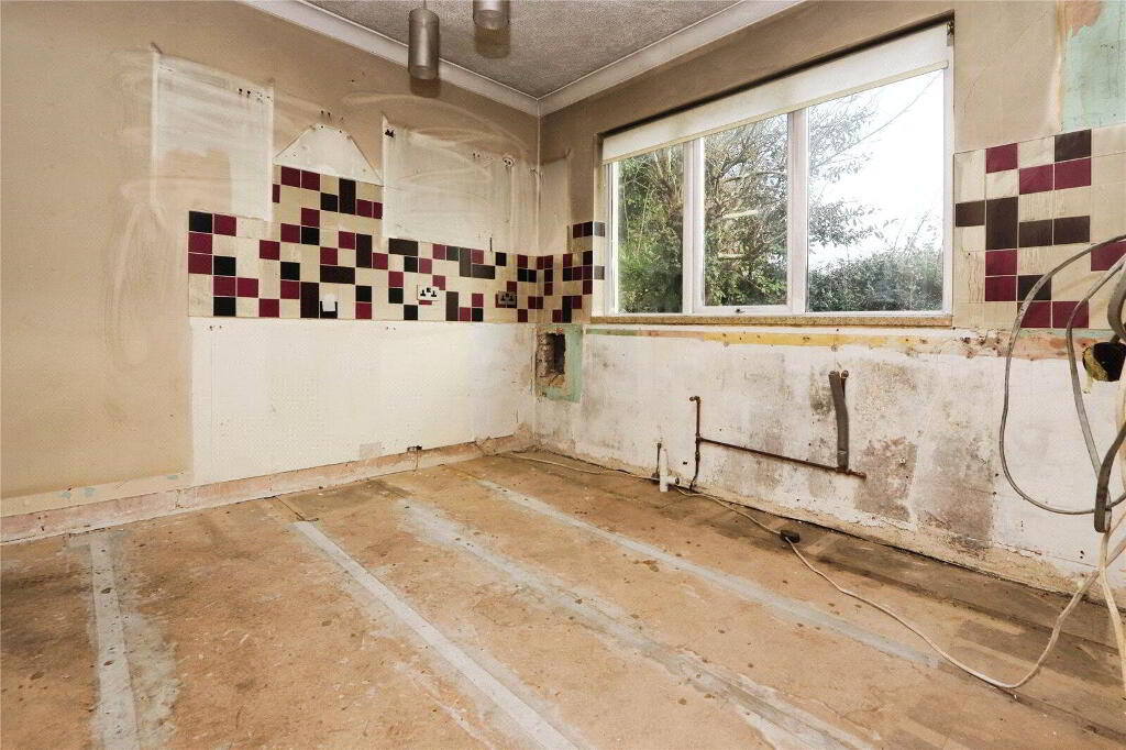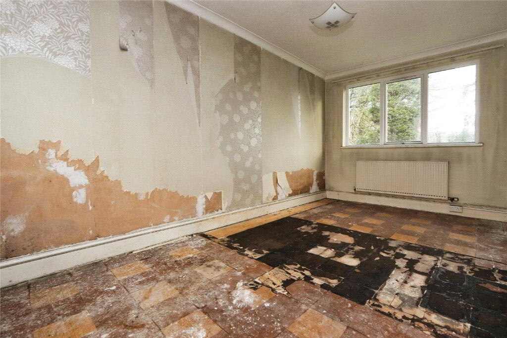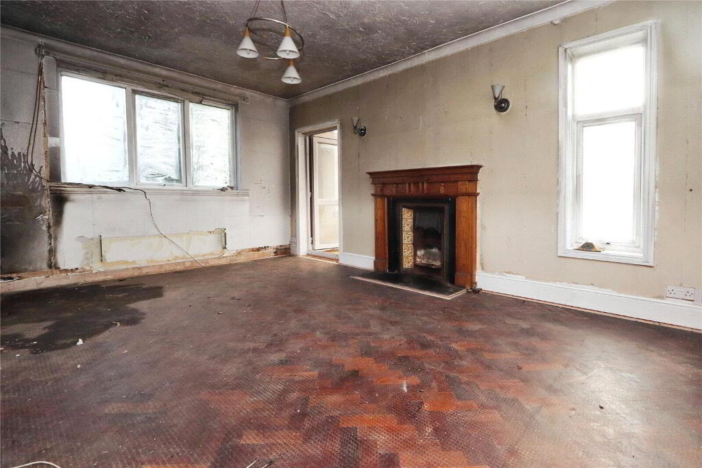 The Kitchen space, currently devoid of units and appliances, offers a blank canvas for you to design your ideal cooking and dining area. The seller is considering installing a basic Kitchen, providing a starting point for customisation. The adjoining Living Room is bright and airy with windows to the front, rear and side. However, some fire damage to the wall and electrics will require attention.