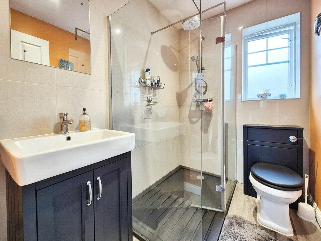 The First Floor comprises 2 generous double Bedrooms and a versatile single Bedroom, ideal as an office space with over-stairs storage. The Main Bedroom benefits from a contemporary En-suite Shower Room, while the second Bedroom offers delightful views of the rear garden. A stylish Family Shower Room features a large walk-in shower enhanced by spotlighting and a modern finish throughout.