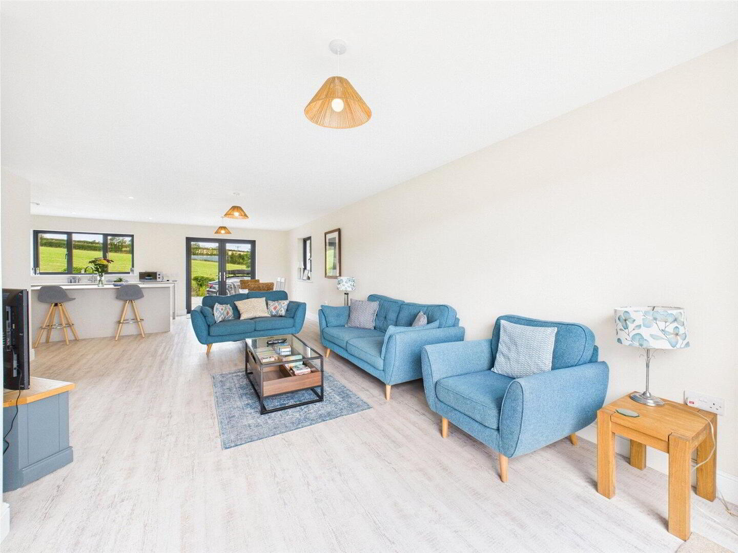 At the heart of the home is a stunning open-plan living, kitchen, and dining area – a wonderfully sociable space, ideal for both relaxed family life and entertaining. The kitchen is sleek and modern, fitted with a range of integrated appliances and a central island unit complete with a built-in wine cooler, perfect for gatherings with friends and family. The living space flows seamlessly toward the rear of the home, where wide bi-folding doors open directly onto a paved patio and lawned garden, framing uninterrupted countryside views that are simply breathtaking.