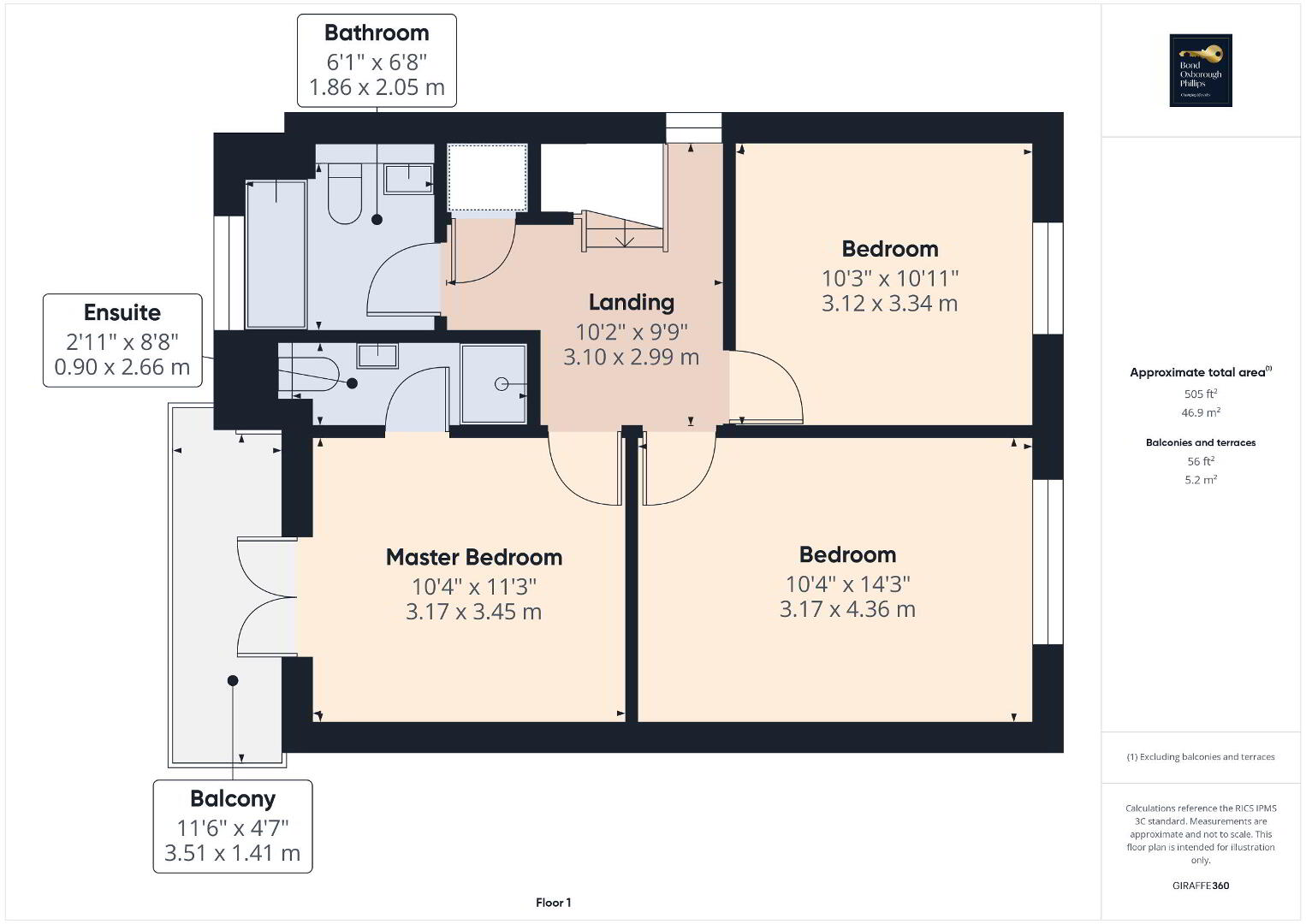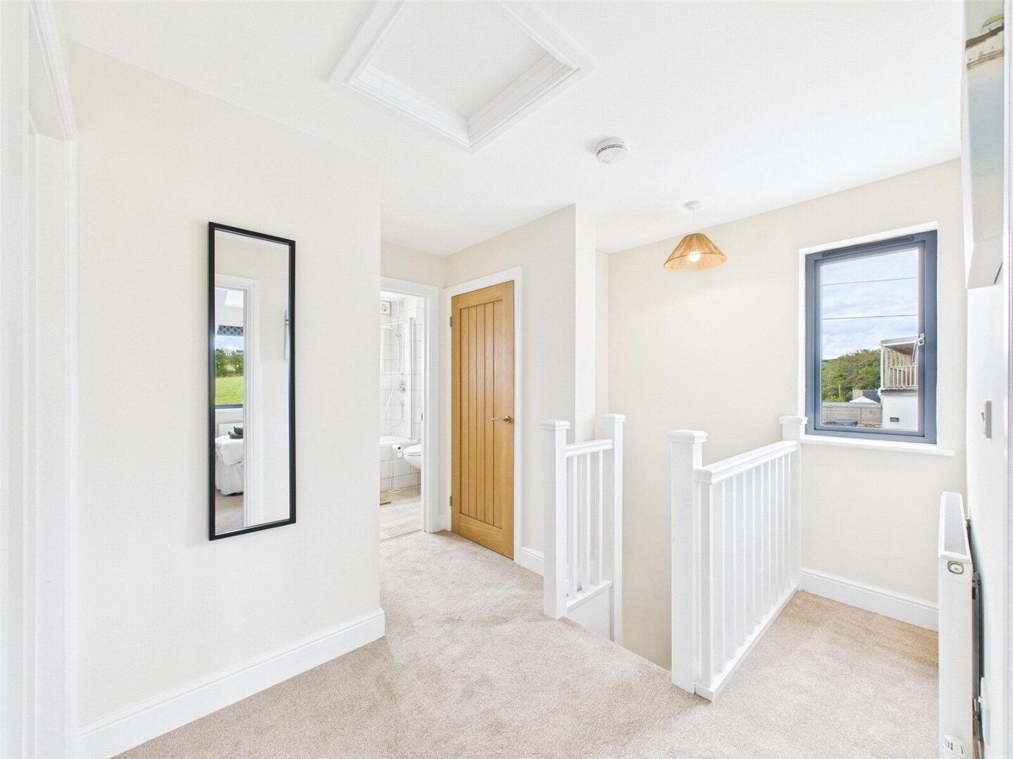 Upstairs, the accommodation continues to impress. The main bedroom is a true retreat, complete with its own en-suite shower room and patio doors opening onto a private, decked balcony with glazed balustrade – the perfect place to enjoy morning coffee while taking in the wide-reaching views. Two further double bedrooms, both generously sized and full of natural light, share a contemporary family bathroom finished with quality fittings.