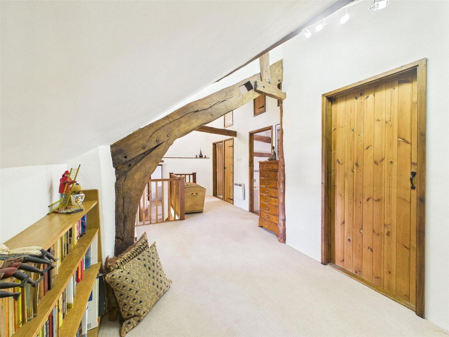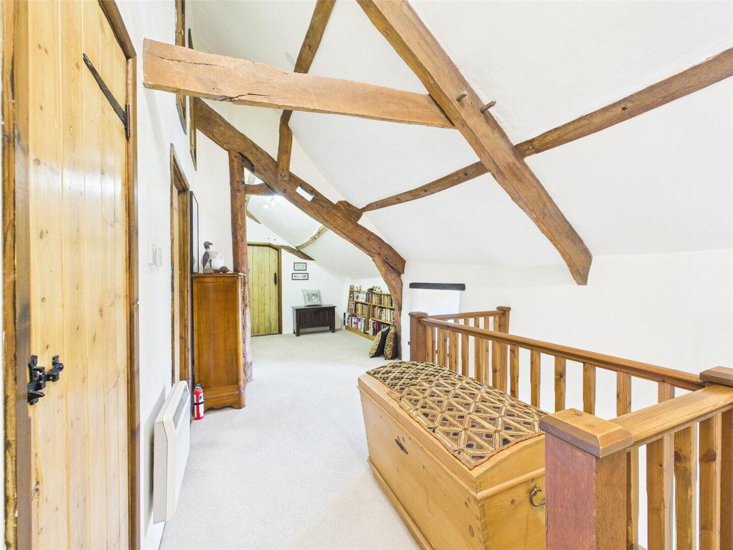 Stepping inside, there is an immediate sense of space and history, with exposed timbers, handcrafted joinery and an abundance of original features that celebrate the building’s origins. The reception hall sets the tone, leading through to a series of versatile living spaces that can adapt to a range of lifestyles. The main sitting room is a particularly inviting space, centred around a substantial fireplace with a multi-fuel stove, offering a cosy retreat during the cooler months, while also enjoying a pleasant outlook across the surrounding setting.