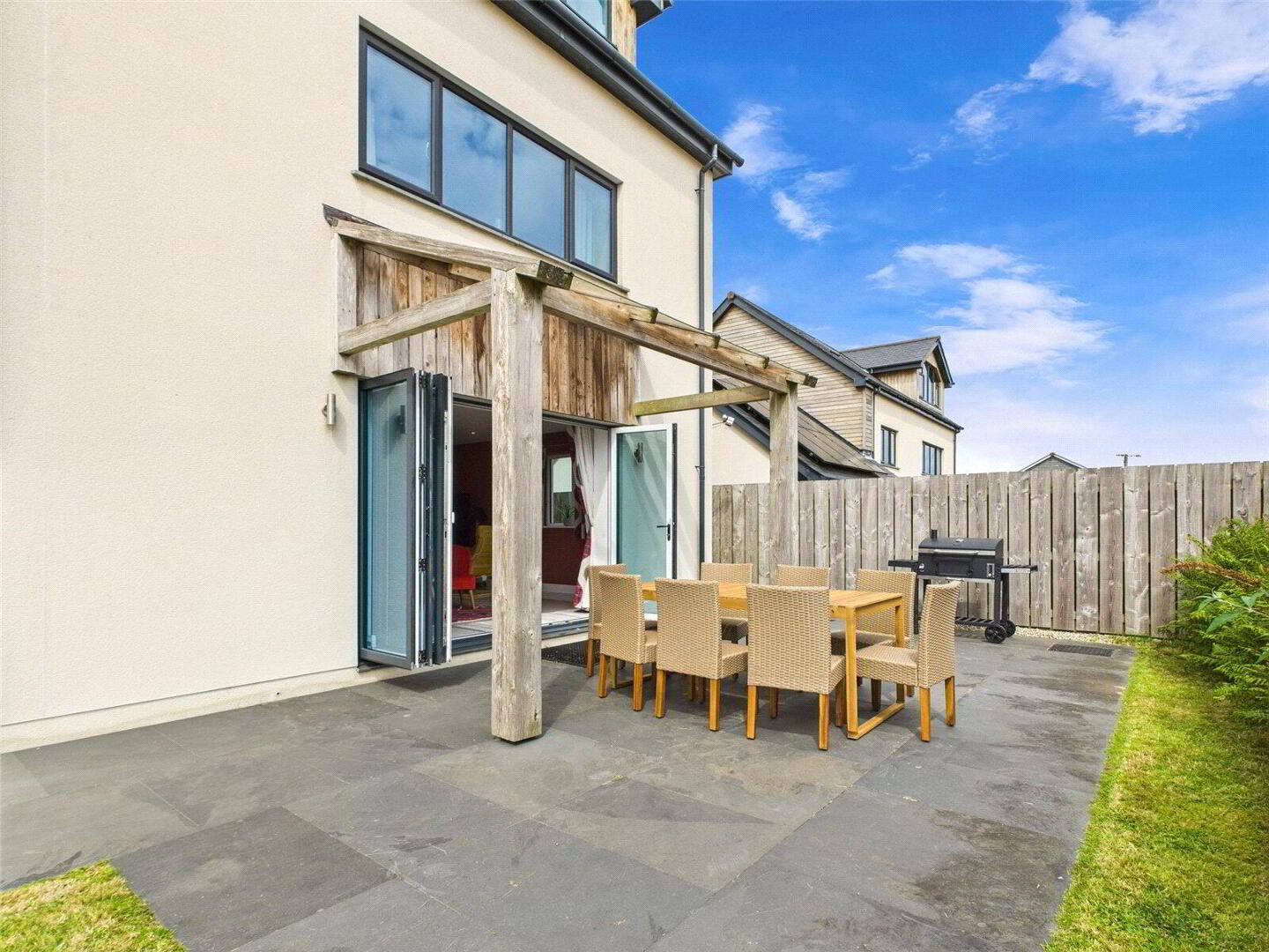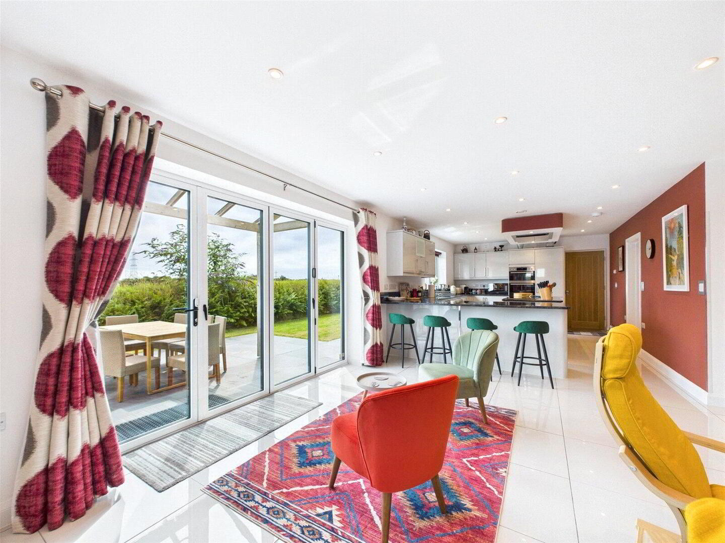The heart of the home is the impressive open-plan kitchen, dining, and living space, designed for modern living and entertaining. The high-end kitchen is fully equipped with integrated appliances including a fridge/freezer, dishwasher, and wine fridge. Bi-fold doors open onto a private rear garden with patio, creating a seamless indoor-outdoor living experience.