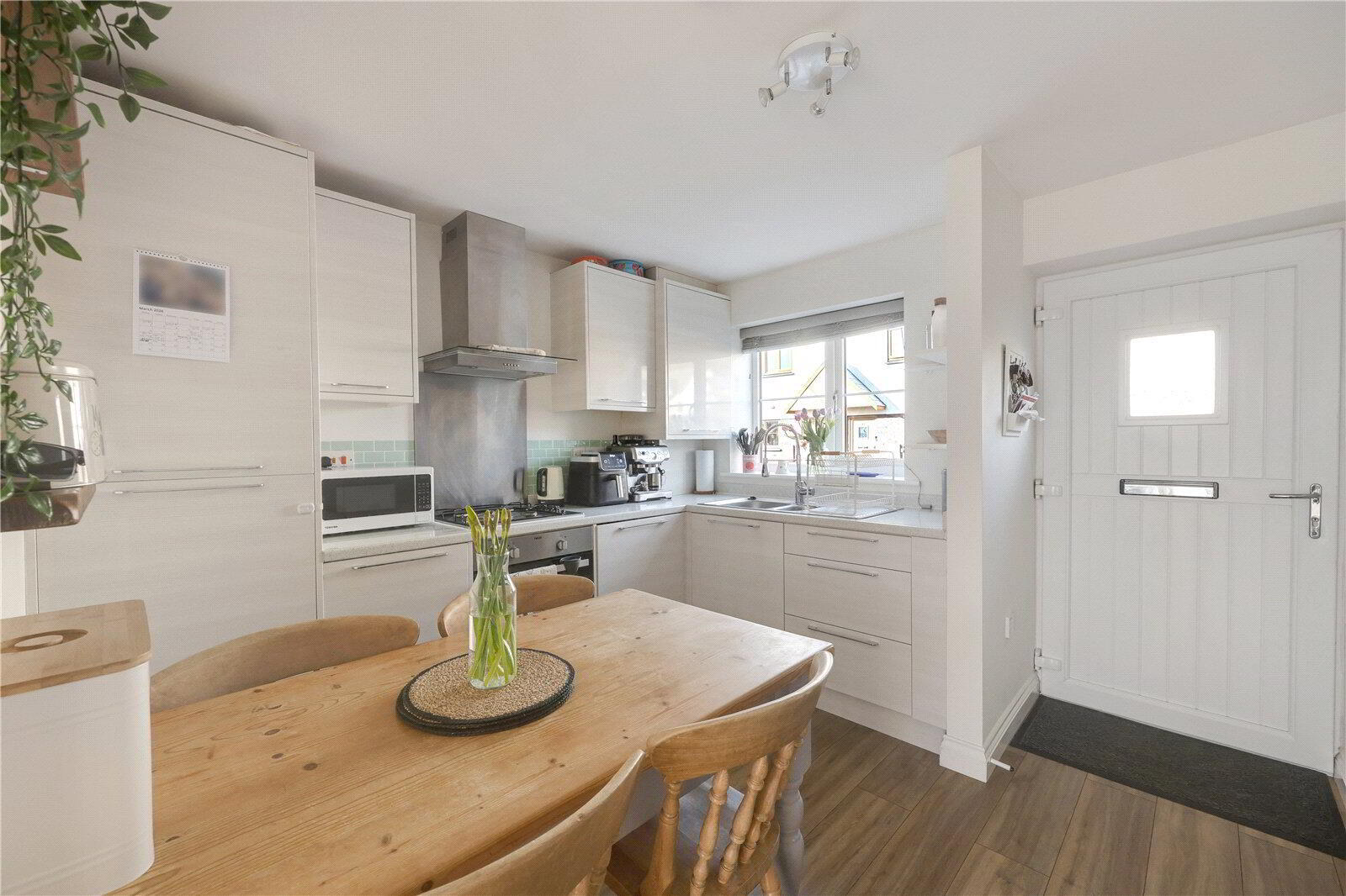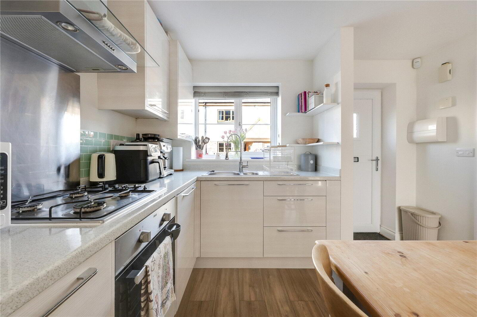 • Contemporary fitted kitchen with integrated appliances, gas hob, and space for dining