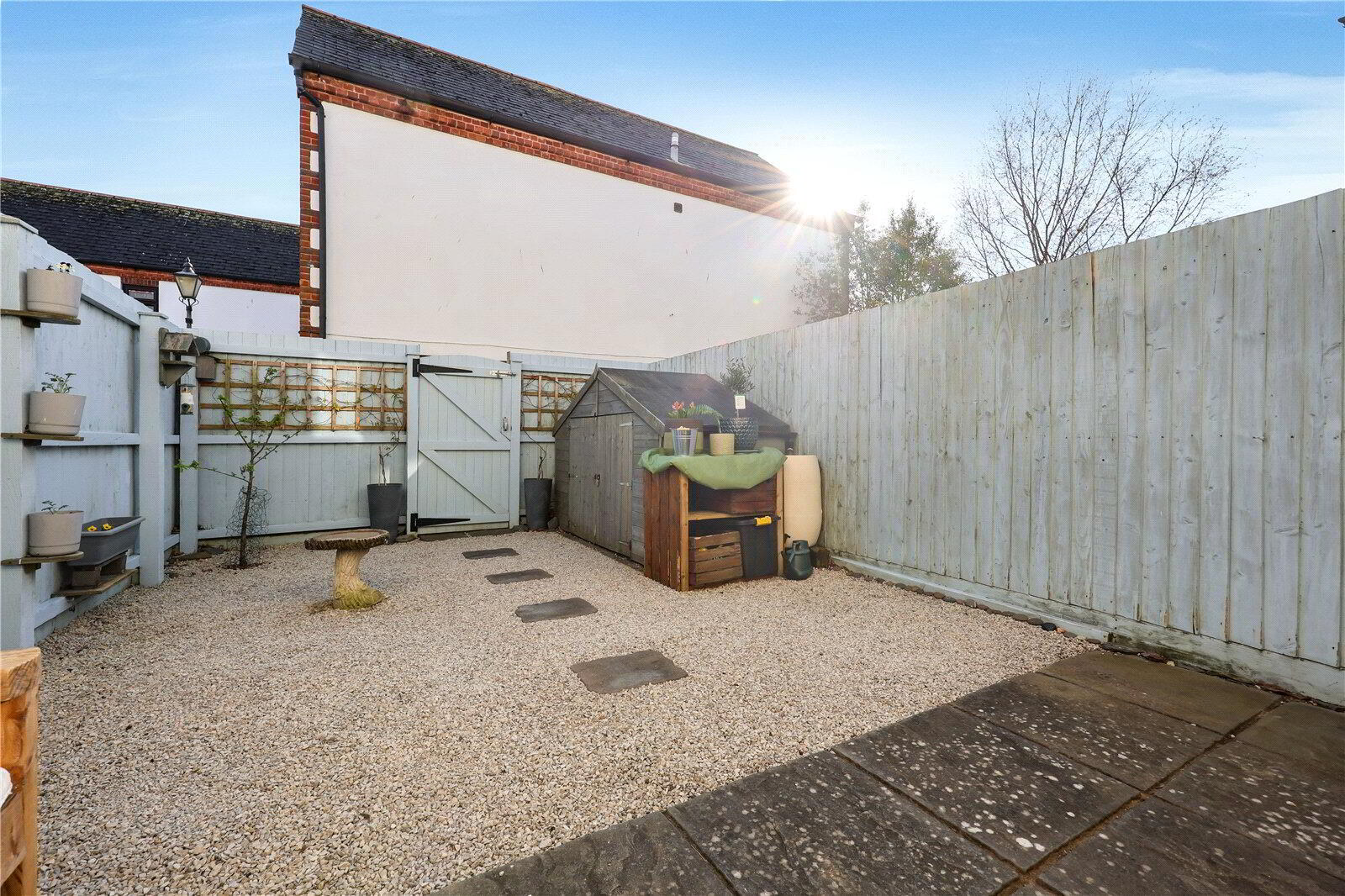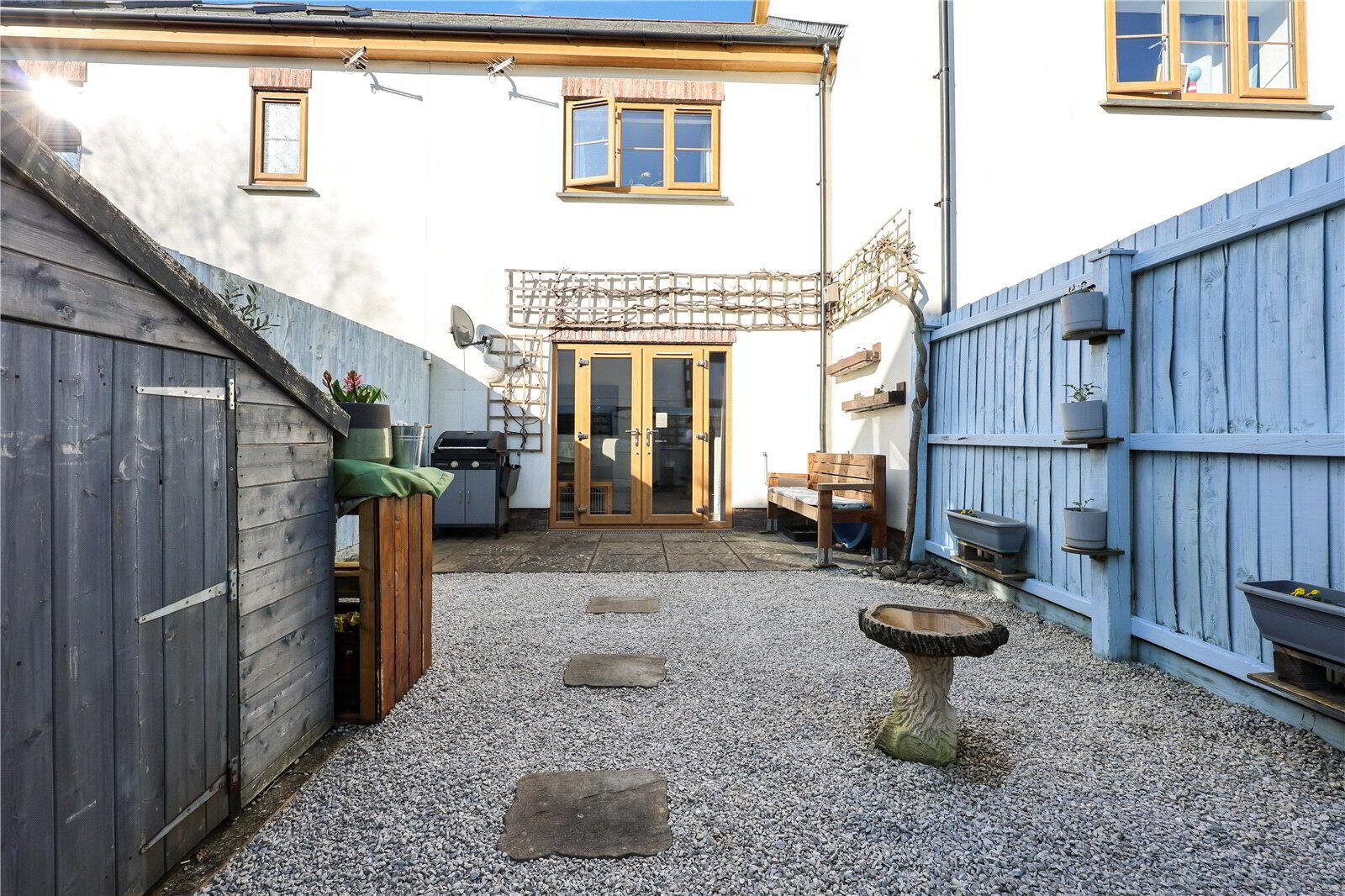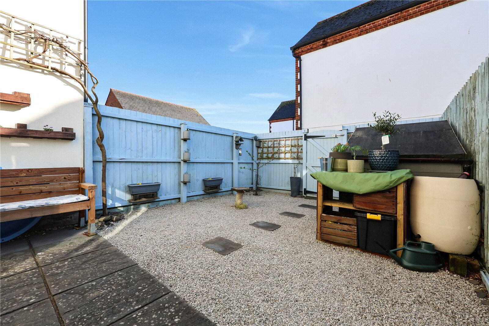 South-Facing Garden - A beautifully maintained outdoor space with light blue fencing, low-maintenance gravel, stepping stone path, raised planters, shelving, a storage shed and a log store. The garden enjoys sunshine throughout the day and offers a peaceful and private place to relax or entertain.
