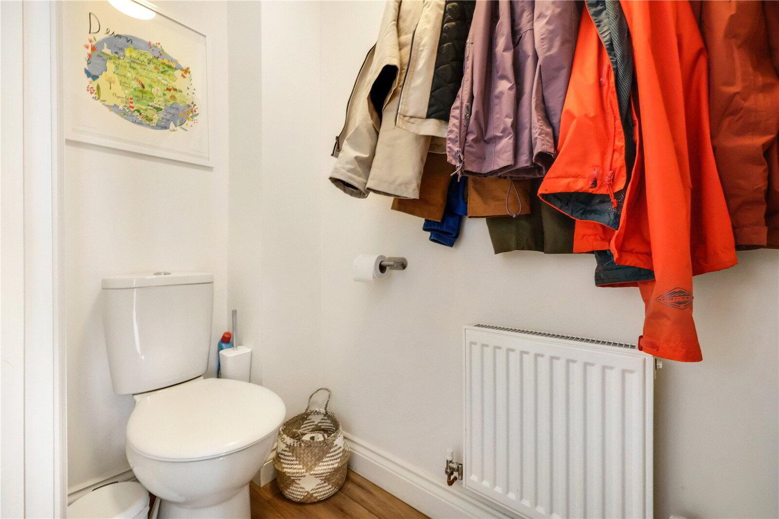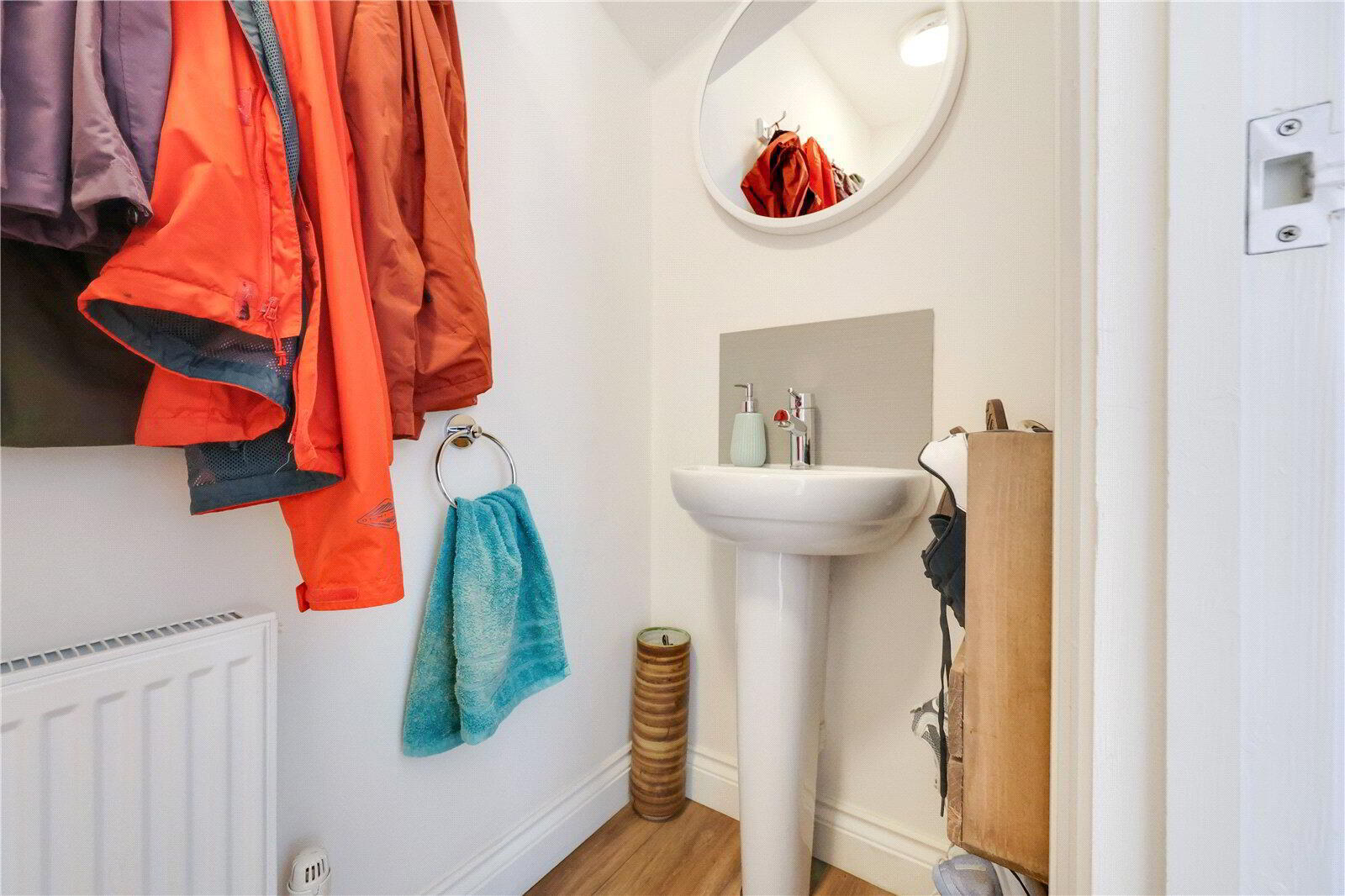 Downstairs Cloakroom - A convenient additional WC with pedestal sink, round mirror, towel radiator and minimalist décor.
