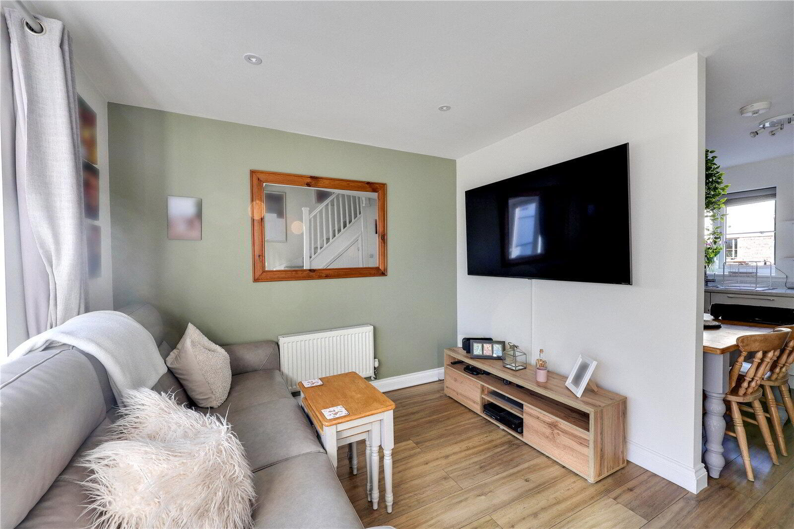 Living Room - A bright and welcoming living space with a soft colour palette and modern décor. The room connects naturally to the kitchen, creating a sociable and open layout. Double doors open directly onto the patio and the south-facing garden, allowing the indoor and outdoor spaces to blend beautifully.