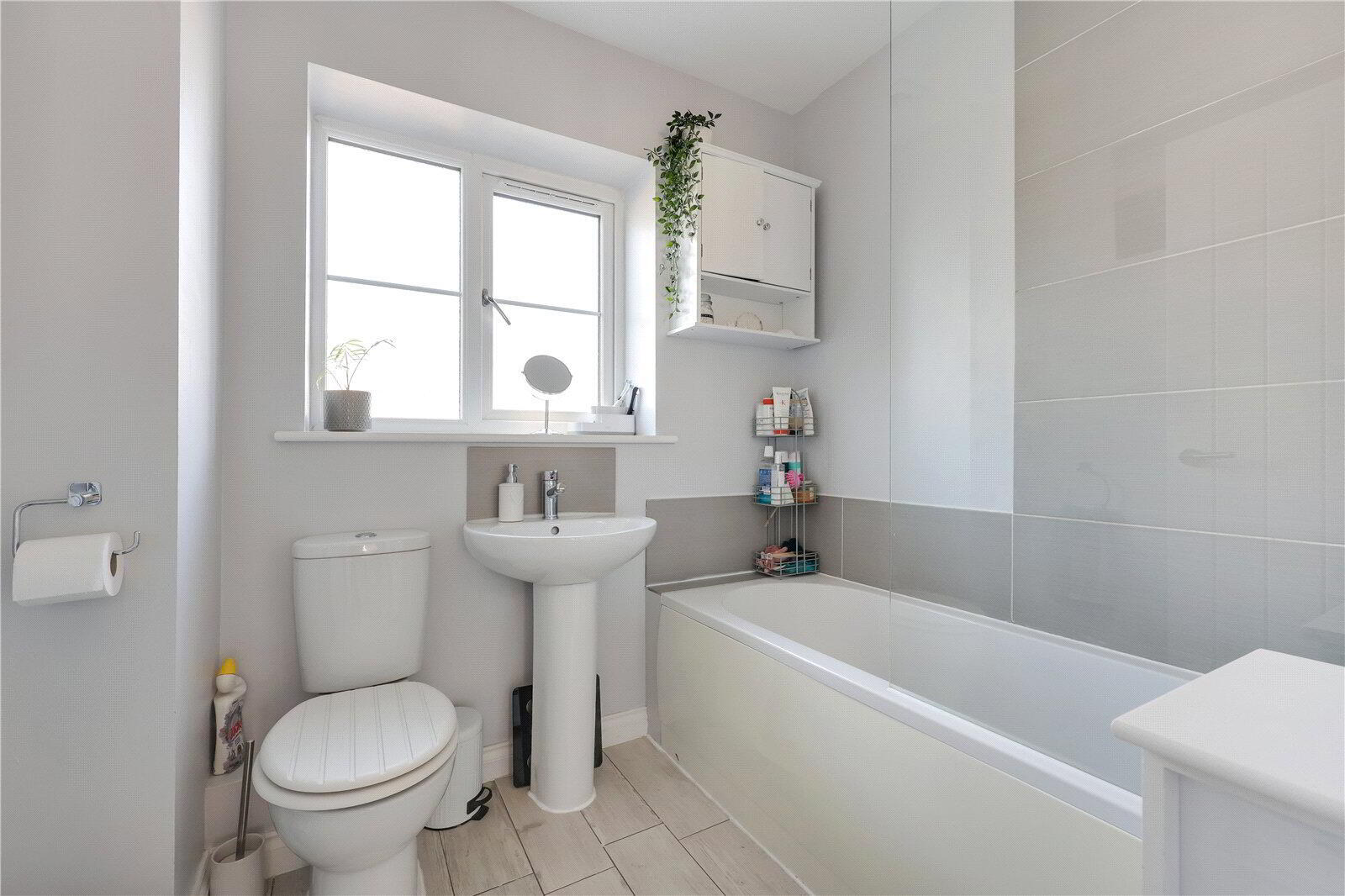 Bathroom - A modern and clean bathroom featuring a white suite with over-bath shower with glass screen, contemporary grey tiling, wood-effect flooring and an overhead storage unit for tidy organisation.